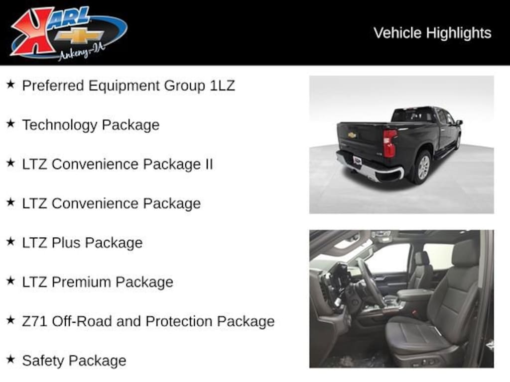 Discover the unparalleled power and sophistication of the 2026 Chevrolet Silverado 1500 LTZ. This remarkable truck is engineered to elevate your driving experience, seamlessly blending exceptional capability with advanced technology and premium comfort.- Multi-Flex Tailgate with six functional load/access features- LTZ Convenience Package II and power sunroof- Z71 Off-Road and Protection Package with heavy-duty air filter and all-terrain tires- Technology Package including Rear Camera Mirror and 15 Head-Up Display- Powerful 3.0L I-6 Duramax Diesel Turbo engine with 305 hp and 495 lb-ft of torqueThe Silverado 1500 LTZ is more than just a truck it's a statement of refined capability. Indulge in the premium Bose sound system, enjoy the convenience of wireless charging, and experience the confidence of advanced safety features like Rear Cross Traffic Braking and Trailer Side Blind Zone Alert.Whether you're tackling tough terrain or navigating the daily commute, this Silverado is built to impress. The 4WD system and off-road-tuned suspension provide exceptional control, while the 12.3 reconfigurable digital display and 15 Head-Up Display keep you informed and connected.Designed to exceed your expectations, the 2026 Chevrolet Silverado 1500 LTZ offers a commanding presence on the road. With an EPA-estimated 22 city/26 highway MPG, this diesel-powered truck delivers impressive efficiency without sacrificing power.Elevate your driving experience with the 2026 Chevrolet Silverado 1500 LTZ. Discover the perfect blend of capability, technology, and luxury that will transform the way you tackle every adventure.At Karl Chevrolet we want to help you find the best new or used car in Ankeny that suits your needs. When you buy a new car at Karl Chevrolet you know you're finding a vehicle you can rely on. We have a great selection of Platinum Quality Pre-Owned Vehicles. We also pride ourselves in creating a friendly atmosphere and a reliable Dealership that you can trust. Call us and our experts will be glad to help you! (515) 299-4300. *Equipment and options are generated by a 3rd party vendor, exact vehicle options may vary. Please see a salesperson for complete details and vehicle information. Price includes: $2500 - Chevrolet Consumer Cash Program. Exp. 03/31/2026 $750 - Chevrolet Bonus Cash. Exp. 03/31/2026 Price includes $2,075 dealer added accessories.