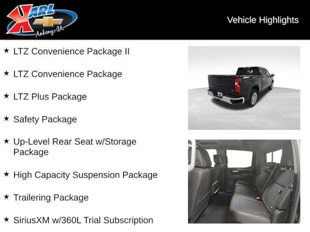 Factory MSRP: $64,945 $5,776 off MSRP! Priced below KBB Fair Purchase Price! 10-Speed Automatic, 4WD, Black Leather, 10-Way Power Driver Seat w/Lumbar, 10-Way Power Passenger Seat Adjuster w/Lumbar, 120-Volt Bed Mounted Power Outlet, 120-Volt Interior Power Outlet, 2 USB Data Ports, 2nd Row Heated Outboard Seats, Adaptive Cruise Control, Air Conditioning, AM/FM radio: SiriusXM with 360L, Auto-dimming door mirrors, Automatic temperature control, Bluetooth® For Phone, Brake assist, Bumpers: chrome, Delay-off headlights, Dual front impact airbags, Dual Rear USB Ports (Charge Only), Electric Rear-Window Defogger, Electronic Cruise Control, Electronic Stability Control, Electronic Transmission Range Selector Shifter, Emergency communication system: OnStar, Floor Mounted Center Console, Following Distance Indicator, Forward Collision Alert, Front Bucket Seats, Front Center Armrest, Front dual zone A/C, Front fog lights, Front Pedestrian Braking, Front Rain-Sensing Wipers, Front reading lights, Front wheel independent suspension, HD Surround Vision, Heated Driver & Front Outboard Passenger Seats, Heated front seats, Heated Steering Wheel, Heated steering wheel, High Capacity Suspension Package, Hitch Guidance, Hitch Guidance w/Hitch View, Illuminated entry, IntelliBeam Automatic High Beam On/Off, LED Cargo Area Lighting, Low tire pressure warning, LTZ Convenience Package, LTZ Convenience Package II, LTZ Plus Package, Outside temperature display, Overhead console, Perforated Leather-Appointed Front Seat Trim, Perimeter Lighting, Power driver seat, Power Front Passenger Windows w/Express Up/Down, Power passenger seat, Power Rear Windows w/Express Down, Power Sliding Rear Window w/Rear Defogger, Power steering, Power Tailgate, Power Tilt & Telescoping Steering Column, Premium Bose 7-Speaker Sound System, Rain sensing wipers, Rear Cross Traffic Braking, Rear Pedestrian Alert, Rear reading lights, Rear Rubberized-Vinyl Floor Mats, Rear Wheelhouse Liners, Rear window defroster, Safety Alert Seat, Safety Package, SiriusXM w/360L Trial Subscription, Standard Tailgate, Steering wheel mounted audio controls, Teen Driver, Telescoping steering wheel, Trailer Camera Provisions, Trailer Side Blind Zone Alert, Trailering Package, Ultrasonic Front & Rear Park Assist, Universal Home Remote, Up-Level Rear Seat w/Storage Package, Ventilated Driver & Front Passenger Seats, Wheels: 20 x 9 Sterling Silver Painted Aluminum, Wireless Charging.