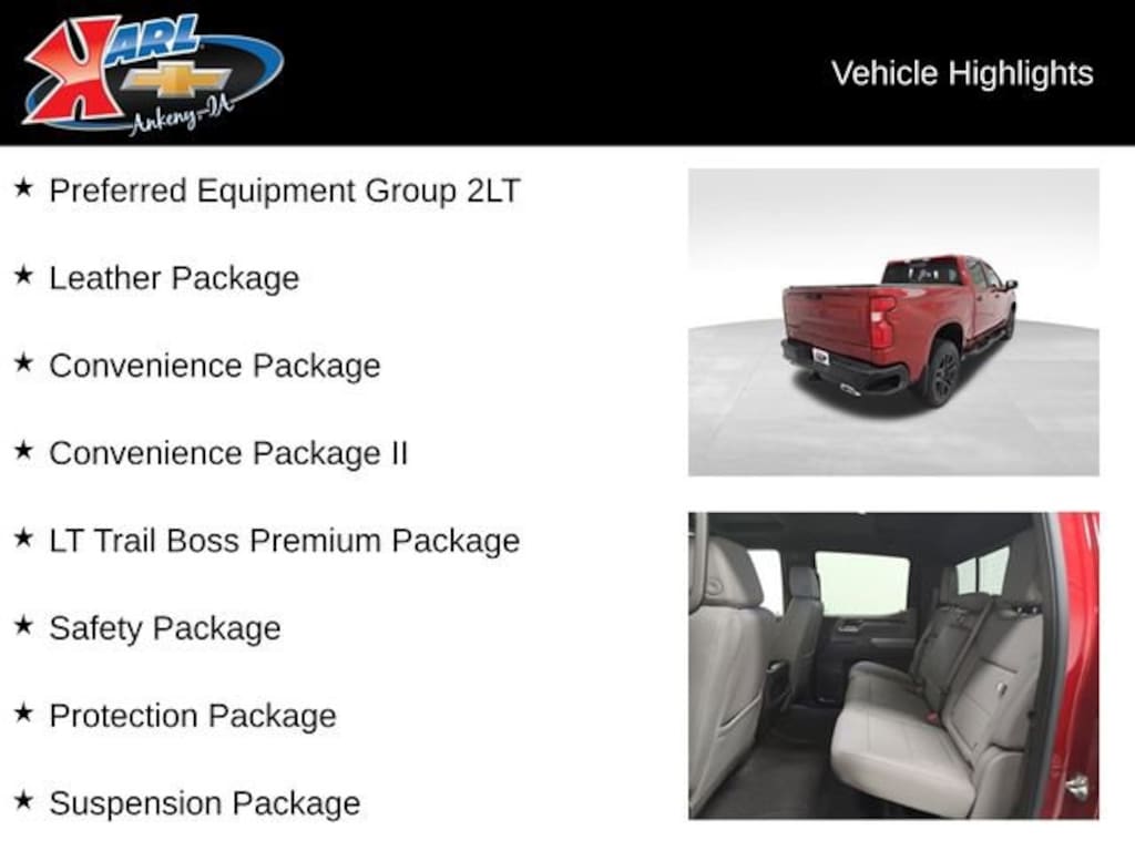 At Karl Chevrolet we want to help you find the best new or used car in Ankeny that suits your needs. When you buy a new car at Karl Chevrolet you know you're finding a vehicle you can rely on. We have a great selection of Platinum Quality Pre-Owned Vehicles. We also pride ourselves in creating a friendly atmosphere and a reliable Dealership that you can trust. Call us and our experts will be glad to help you! (515) 299-4300. *Equipment and options are generated by a 3rd party vendor, exact vehicle options may vary. Please see a salesperson for complete details and vehicle information. Price includes: $4250 - Chevrolet Consumer Cash Program. Exp. 04/30/2026 $500 - Chevrolet Bonus Cash. Exp. 04/30/2026 Price includes $2,493 dealer added accessories.