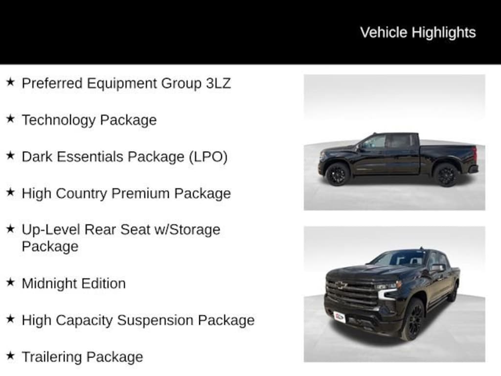Factory MSRP: $77,180 $6,535 off MSRP! 10-Way Power Driver Seat w/Lumbar, 10-Way Power Passenger Seat Adjuster w/Lumbar, 12.3 Multicolor Reconfigurable Digital Display, 120-Volt Bed Mounted Power Outlet, 120-Volt Interior Power Outlet, 15 Diagonal Multicolor Head-Up Display, 2 USB Data Ports, 2nd Row Heated Outboard Seats, Adaptive Cruise Control, Adaptive Ride Control Suspension, All-Weather Floor Liner (LPO), Apple CarPlay/Android Auto, Auto-Dimming Inside Rear-View Mirror, Auto-Locking Rear Differential, Bed View Camera, Black Body Side Moldings, Black Door Handles, Black Dual Exhaust Tips, Black Grille, Black Mirror Caps, Black Name Plates (LPO), Black Power-Retractable Assist Steps, Black Tailgate CHEVROLET Lettering (LPO), Bluetooth® For Phone, Bodyside moldings, Bumpers: body-color, Chevytec Spray-On Black Bedliner, Chrome Assist Steps, Chrome Recovery Hooks, Color-Keyed Carpeting Floor Covering, Dark Essentials Package (LPO), Dark Headlamp Bezel, Deep-Tinted Glass, Driver Memory, Dual Exhaust w/Polished Outlets, Dual Rear USB Ports (Charge Only), Electric Rear-Window Defogger, Electronic Transmission Range Selector Shifter, Floor Mounted Center Console, Front Black Bowtie Emblem (LPO), Front Bucket Seats, Front Carpeted Floor Mats, Front Center Armrest, Front Frame-Mounted Black Recovery Hooks, Front LED Fog Lamps, Front License Plate Kit, Front Rain-Sensing Wipers, Galvano Silver Painted Mirror Caps, HD Surround Vision, Heated door mirrors, Heated Driver & Front Outboard Passenger Seats, Heated rear seats, Heated Steering Wheel, High Capacity Suspension Package, High Country Premium Package, Hitch Guidance, Hitch Guidance w/Hitch View, In-Vehicle Trailering System App, Integrated Trailer Brake Controller, IntelliBeam Automatic High Beam On/Off, Keyless Open & Start, LED Cargo Area Lighting, Midnight Edition, OnStar Services Capable, Outside Heated Power-Adjustable Mirrors, Perforated Leather Seat Trim, Perimeter Lighting, Power Front Passenger Windows w/Express Up/Down, Power Front Windows w/Driver Express Up/Down, Power passenger seat, Power Rear Windows w/Express Down, Power Sliding Rear Window w/Rear Defogger, Power Sunroof, Power Tailgate, Power Tilt & Telescoping Steering Column, Preferred Equipment Group 3LZ, Premium audio system: Chevrolet Infotainment 3 Premium, Premium Bose 7-Speaker Sound System, Radio: Chevrolet Infotainment 3 Premium System, Rear Camera Mirror, Rear Carpeted Floor Mats, Rear Cross Traffic Braking, Rear Pedestrian Alert, Rear Wheelhouse Liners, Remote Vehicle Starter System, Safety Alert Seat, SiriusXM w/360L Trial Subscription, Split folding rear seat, Standard Tailgate, Steering Wheel Audio Controls, Technology Package, Teen Driver, Theft Deterrent System (Unauthorized Entry), Tire Pressure Monitoring System, Trailer Camera Provisions, Trailer Side Blind Zone Alert, Trailering Package, Ultrasonic Front & Rear Park Assist, Universal Home Remote, Up-Level Rear Seat w/Storage Package, Ventilated Driver & Front Passenger Seats, Wheels: 20 x 9 High Gloss Black Painted Alum, Wheels: 22 High Gloss Black (LPO), Wheels: 22 Transit Steel (LPO), Wheels: 22 x 9 Painted Aluminum, Wi-Fi Hot Spot Capable, Wrapped Steering Wheel.