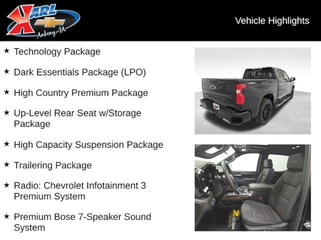 Factory MSRP: $79,949 $6,993 off MSRP! 10-Speed Automatic, 4WD, Jet Blk Perforated Lth Leather, 10-Way Power Driver Seat w/Lumbar, 10-Way Power Passenger Seat Adjuster w/Lumbar, 12.3 Multicolor Reconfigurable Digital Display, 15 Diagonal Multicolor Head-Up Display, 2nd Row Heated Outboard Seats, 3 Years SiriusXM, Adaptive Ride Control Suspension, All-Weather Floor Liner (LPO), Apple CarPlay/Android Auto, Black Name Plates (LPO), Bodyside moldings, Bumpers: body-color, Chevytec Spray-On Black Bedliner, Chrome Assist Steps, Dark Essentials Package (LPO), Dual Exhaust w/Polished Outlets, Electronic Transmission Range Selector Shifter, Front Bucket Seats, Front Center Armrest, Front LED Fog Lamps, Galvano Silver Painted Mirror Caps, Heated door mirrors, Heated Driver & Front Outboard Passenger Seats, Heated rear seats, High Capacity Suspension Package, High Country Premium Package, Hitch Guidance, IntelliBeam Automatic High Beam On/Off, LED Cargo Area Lighting, Multi-Flex Tailgate, Perforated Leather Seat Trim, Power passenger seat, Power Sunroof, Premium audio system: Chevrolet Infotainment 3 Premium, Premium Bose 7-Speaker Sound System, Radio: Chevrolet Infotainment 3 Premium System, Rear Camera Mirror, Split folding rear seat, Technology Package, Trailering Package, Up-Level Rear Seat w/Storage Package, Ventilated Driver & Front Passenger Seats, Wheels: 22 High Gloss Black (LPO), Wheels: 22 Transit Steel (LPO), Wheels: 22 x 9 Painted Aluminum.