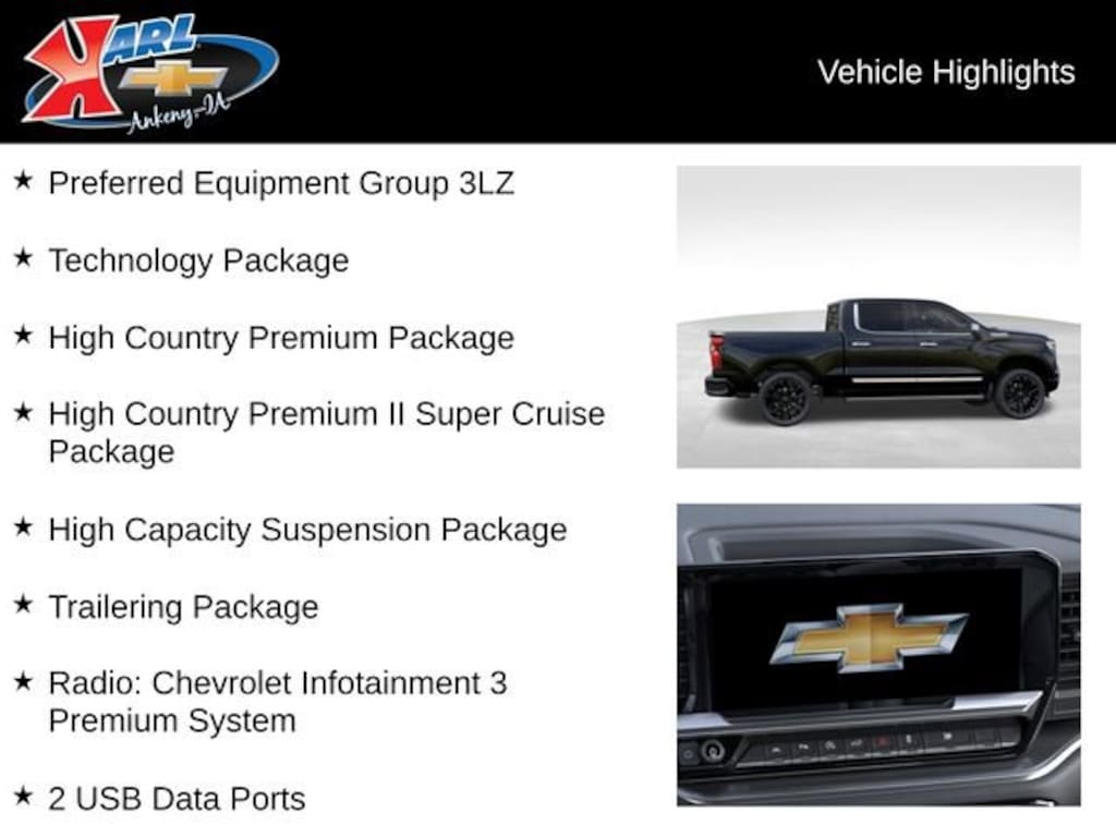 At Karl Chevrolet we want to help you find the best new or used car in Ankeny that suits your needs. When you buy a new car at Karl Chevrolet you know you're finding a vehicle you can rely on. We have a great selection of Platinum Quality Pre-Owned Vehicles. We also pride ourselves in creating a friendly atmosphere and a reliable Dealership that you can trust. Call us and our experts will be glad to help you! (515) 299-4300. *Equipment and options are generated by a 3rd party vendor, exact vehicle options may vary. Please see a salesperson for complete details and vehicle information. Price includes: $1250 - Chevrolet Consumer Cash Program. Exp. 04/30/2026 $750 - Chevrolet Bonus Cash. Exp. 04/30/2026