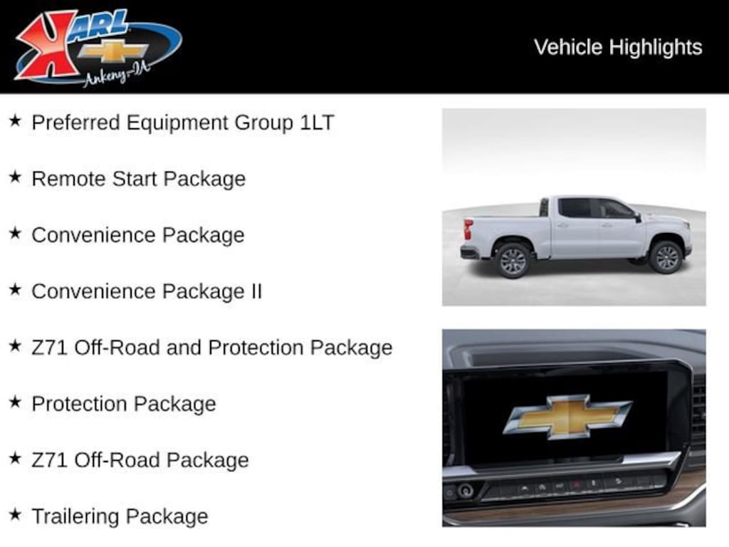 At Karl Chevrolet we want to help you find the best new or used car in Ankeny that suits your needs. When you buy a new car at Karl Chevrolet you know you're finding a vehicle you can rely on. We have a great selection of Platinum Quality Pre-Owned Vehicles. We also pride ourselves in creating a friendly atmosphere and a reliable Dealership that you can trust. Call us and our experts will be glad to help you! (515) 299-4300. *Equipment and options are generated by a 3rd party vendor, exact vehicle options may vary. Please see a salesperson for complete details and vehicle information. Price includes: $1250 - Chevrolet Consumer Cash Program. Exp. 04/30/2026 $750 - Chevrolet Bonus Cash. Exp. 04/30/2026