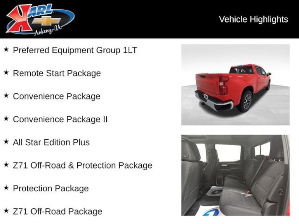 Factory MSRP: $60,835 $5,750 off MSRP! 10-Speed Automatic, 4WD, Jet Blk Clth Cloth, 10-Way Power Driver Seat w/Lumbar, 12.3 Multicolor Reconfigurable Digital Display, 120-Volt Bed Mounted Power Outlet, 120-Volt Interior Power Outlet, 220 Amp Alternator, 40/20/40 Front Split-Bench Seat, 6-Speaker Audio System, Air Conditioning, All Star Edition Plus, All-Star Edition, All-Weather Floor Liner (LPO) (AAK), AM/FM radio: SiriusXM with 360L, Apple CarPlay/Android Auto, Auto-Locking Rear Differential, Bluetooth® For Phone, Brake assist, Chevytec Spray-On Black Bedliner, Chrome Mirror Caps, Cloth Seat Trim, Color-Keyed Carpeting Floor Covering, Convenience Package, Convenience Package II, Deep-Tinted Glass, Dual Exhaust w/Polished Outlets, Dual front side impact airbags, Dual Rear USB Ports (Charge Only), Dual-Zone Automatic Climate Control, Electric Rear-Window Defogger, Electronic Cruise Control, Electronic Stability Control, Emergency communication system: OnStar, External Engine Oil Cooler, EZ Lift Power Lock & Release Tailgate, Forward Collision Alert, Front Center Armrest w/Storage, Front dual zone A/C, Front Frame-Mounted Black Recovery Hooks, Front License Plate Kit, Front Pedestrian Braking, Front Rubberized Vinyl Floor Mats, Front wheel independent suspension, HD Rear Vision Camera, Heated Driver & Front Outboard Passenger Seats, Heated Power-Adjustable Outside Mirrors, Heated Steering Wheel, Heated steering wheel, Heavy-Duty Air Filter, Hill Descent Control, Hitch Guidance, Hitch Guidance w/Hitch View, In-Vehicle Trailering System App, Inside Rear-View Mirror w/Tilt, Integrated Trailer Brake Controller, Keyless Open & Start, Lane Keep Assist w/Lane Departure Warning, LED Cargo Area Lighting, Manual Tilt/Telescoping Steering Column, Off-Road Suspension, OnStar Services Capable, Outside temperature display, Overhead console, Power Front Windows w/Driver Express Up/Down, Power Front Windows w/Passenger Express Down, Power Rear Windows w/Express Down, Power Sliding Rear Window w/Rear Defogger, Power windows, Preferred Equipment Group 1LT, Premium audio system: Chevrolet Infotainment 3 Premium, Protection Package, Rear 60/40 Folding Bench Seat (Folds Up), Rear Rubberized-Vinyl Floor Mats, Rear step bumper, Rear Wheelhouse Liners, Rear window defroster, Remote keyless entry, Remote Start Package, Remote Vehicle Starter System, SiriusXM w/360L Trial Subscription, Standard Suspension Package, Standard Tailgate, Steering Wheel Audio Controls, Teen Driver, Theft Deterrent System (Unauthorized Entry), Tire Pressure Monitoring System, Trailering Package, Universal Home Remote, Variably intermittent wipers, Wheels: 18 x 8.5 Bright Silver Painted Aluminum, Wheels: 20 x 9 Painted Aluminum, Wi-Fi Hot Spot Capable, Wrapped Steering Wheel, Z71 Off-Road & Protection Package, Z71 Off-Road Package.