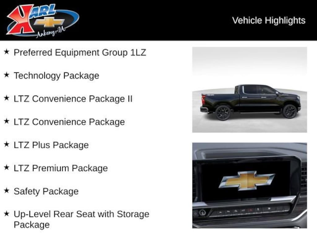 At Karl Chevrolet we want to help you find the best new or used car in Ankeny that suits your needs. When you buy a new car at Karl Chevrolet you know you're finding a vehicle you can rely on. We have a great selection of Platinum Quality Pre-Owned Vehicles. We also pride ourselves in creating a friendly atmosphere and a reliable Dealership that you can trust. Call us and our experts will be glad to help you! (515) 299-4300. *Equipment and options are generated by a 3rd party vendor, exact vehicle options may vary. Please see a salesperson for complete details and vehicle information. Price includes: $4250 - Chevrolet Consumer Cash Program. Exp. 04/30/2026 $500 - Chevrolet Bonus Cash. Exp. 04/30/2026