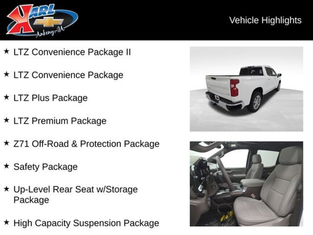 Factory MSRP: $68,520 $5,044 off MSRP! 10-Speed Automatic, 4WD, Jet Black Leather, 12.3 Multicolor Reconfigurable Digital Display, 120-Volt Bed Mounted Power Outlet, 120-Volt Interior Power Outlet, 15 Diagonal Multicolor Head-Up Display, 2 USB Data Ports, 2nd Row Heated Outboard Seats, Adaptive Cruise Control, Air Conditioning, All-Weather Floor Liner (LPO) (AAK), AM/FM radio: SiriusXM with 360L, Automatic temperature control, Bed View Camera, Bluetooth® For Phone, Brake assist, Chevytec Spray-On Black Bedliner, Color-Keyed Carpeting Floor Covering, Compass, Delay-off headlights, Dual Exhaust w/Black Exhaust Tips, Dual front impact airbags, Dual Rear USB Ports (Charge Only), Electric Rear-Window Defogger, Emergency communication system: OnStar, Floor Mounted Center Console, Forward Collision Alert, Front Bucket Seats, Front Center Armrest, Front dual zone A/C, Front fog lights, Front Frame-Mounted Black Recovery Hooks, Front Pedestrian Braking, Front Rain-Sensing Wipers, Front wheel independent suspension, HD Surround Vision, Heated door mirrors, Heated Driver & Front Outboard Passenger Seats, Heated Steering Wheel, Heavy-Duty Air Filter, High Capacity Suspension Package, Hill Descent Control, Hitch Guidance, Hitch Guidance w/Hitch View, Illuminated entry, In-Vehicle Trailering System App, IntelliBeam Automatic High Beam On/Off, Lane Keep Assist w/Lane Departure Warning, Low tire pressure warning, LTZ Convenience Package, LTZ Convenience Package II, LTZ Plus Package, LTZ Premium Package, Off-Road Suspension, Outside Heated Power-Adjustable Mirrors, Outside temperature display, Overhead console, Passenger vanity mirror, Perimeter Lighting, Power door mirrors, Power driver seat, Power Front Windows w/Driver Express Up/Down, Power passenger seat, Power Sliding Rear Window w/Rear Defogger, Power steering, Power Sunroof, Power Tailgate, Power Tilt & Telescoping Steering Column, Power windows, Premium audio system: Chevrolet Infotainment 3 Premium, Premium Bose 7-Speaker Sound System, Radio: Chevrolet Infotainment 3 Premium System, Rain sensing wipers, Rear Cross Traffic Braking, Rear Pedestrian Alert, Rear reading lights, Rear Rubberized-Vinyl Floor Mats, Rear step bumper, Rear Wheelhouse Liners, Rear window defroster, Remote Vehicle Starter System, Safety Alert Seat, Safety Package, SiriusXM w/360L Trial Subscription, Steering wheel mounted audio controls, Traction control, Trailer Camera Provisions, Trailer Side Blind Zone Alert, Trailering Package, Ultrasonic Front & Rear Park Assist, Universal Home Remote, Up-Level Rear Seat w/Storage Package, Ventilated Driver & Front Passenger Seats, Wheels: 20 x 9 Sterling Silver Painted Aluminum, Wi-Fi Hot Spot Capable, Wireless Charging, Z71 Off-Road & Protection Package, Z71 Off-Road Package.Summit White 2026 Chevrolet Silverado 1500 LTZ 4D Crew Cab EcoTec3 5.3L V8 10-Speed Automatic 4WD Price includes: $1000 - GM Bonus Cash. Exp. 11/03/2025 $2000 - Chevrolet Consumer Cash Program. Exp. 11/03/2025