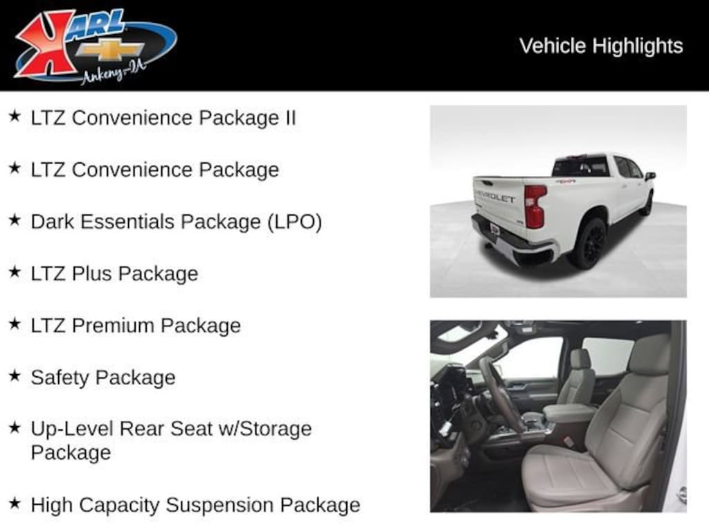 Factory MSRP: $74,610 $6,751 off MSRP! 10-Speed Automatic, 4WD, Gideon/Very Dark Atmosphere Leather, 10-Way Power Driver Seat w/Lumbar, 10-Way Power Passenger Seat Adjuster w/Lumbar, 12.3 Multicolor Reconfigurable Digital Display, 120-Volt Bed Mounted Power Outlet, 120-Volt Interior Power Outlet, 15 Diagonal Multicolor Head-Up Display, 2 USB Data Ports, 2nd Row Heated Outboard Seats, Adaptive Cruise Control, Air Conditioning, AM/FM radio: SiriusXM with 360L, Auto-Dimming Inside Rear-View Mirror, Auto-dimming Rear-View mirror, Automatic temperature control, Bed View Camera, Black Name Plates (LPO), Bluetooth® For Phone, Brake assist, Bumpers: chrome, Chevytec Spray-On Black Bedliner, Compass, Dark Essentials Package (LPO), Deep-Tinted Glass, Driver Memory, Dual Active Exhaust, Dual front impact airbags, Dual front side impact airbags, Dual Rear USB Ports (Charge Only), Electric Rear-Window Defogger, Electronic Cruise Control, Electronic Stability Control, Floor Mounted Center Console, Forward Collision Alert, Front anti-roll bar, Front Center Armrest, Front dual zone A/C, Front Frame-Mounted Black Recovery Hooks, Front Pedestrian Braking, Front Rain-Sensing Wipers, Front Rubberized Vinyl Floor Mats, Front wheel independent suspension, HD Surround Vision, Heated Driver & Front Outboard Passenger Seats, Heated front seats, Heated steering wheel, High Capacity Suspension Package, Hitch Guidance, Hitch Guidance w/Hitch View, In-Vehicle Trailering System App, Integrated Trailer Brake Controller, IntelliBeam Automatic High Beam On/Off, LED Cargo Area Lighting, Low tire pressure warning, LTZ Convenience Package, LTZ Convenience Package II, LTZ Plus Package, LTZ Premium Package, Occupant sensing airbag, Outside Heated Power-Adjustable Mirrors, Overhead console, Passenger vanity mirror, Perforated Leather-Appointed Front Seat Trim, Perimeter Lighting, Power door mirrors, Power driver seat, Power Front Passenger Windows w/Express Up/Down, Power Front Windows w/Driver Express Up/Down, Power Sliding Rear Window w/Rear Defogger, Power steering, Power Sunroof, Power Tailgate, Power Tilt & Telescoping Steering Column, Power windows, Premium Bose 7-Speaker Sound System, Radio data system, Rain sensing wipers, Rear Cross Traffic Braking, Rear Pedestrian Alert, Rear step bumper, Rear Wheelhouse Liners, Remote Vehicle Starter System, Safety Alert Seat, Safety Package, SiriusXM w/360L Trial Subscription, Steering wheel mounted audio controls, Trailer Camera Provisions, Trailer Side Blind Zone Alert, Trailering Package, Ultrasonic Front & Rear Park Assist, Universal Home Remote, Up-Level Rear Seat w/Storage Package, Ventilated Driver & Front Passenger Seats, Wheels: 20 x 9 Sterling Silver Painted Aluminum, Wheels: 22 Transit Steel (LPO), Wi-Fi Hot Spot Capable, Wireless Charging.