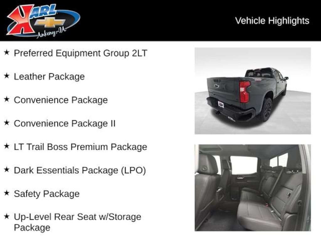 Factory MSRP: $70,574 $6,501 off MSRP! 10-Speed Automatic, 4WD, Jet Blk Lth-Appointed Fro Leather, 10-Way Power Driver Seat w/Lumbar, 12.3 Multicolor Reconfigurable Digital Display, 120-Volt Bed Mounted Power Outlet, 120-Volt Interior Power Outlet, 2 USB Data Ports, 3 Years SiriusXM, 6-Speaker Audio System, All-Weather Floor Liner (LPO) (AAK), Apple CarPlay/Android Auto, Auto-Locking Rear Differential, Black Name Plates (LPO), Bluetooth® For Phone, Chevytec Spray-On Black Bedliner, Color-Keyed Carpeting Floor Covering, Convenience Package, Convenience Package II, Dark Essentials Package (LPO), Deep-Tinted Glass, Dual Rear USB Ports (Charge Only), Dual-Zone Automatic Climate Control, Electric Rear-Window Defogger, Electronic Cruise Control, Electronic Transmission Range Selector Shifter, EZ Lift Power Lock & Release Tailgate, Floor Mounted Center Console, Front Bucket Seats, Front LED Fog Lamps, HD Rear Vision Camera, HD Surround Vision, Heated door mirrors, Heated Driver & Front Outboard Passenger Seats, Heated Power-Adjustable Outside Mirrors, Heated Steering Wheel, Heavy-Duty Air Filter, High Gloss Black Mirror Caps, Hill Descent Control, Hitch Guidance, Hitch Guidance w/Hitch View, In-Vehicle Trailering System App, Inside Rear-View Mirror w/Tilt, Integrated Trailer Brake Controller, IntelliBeam Automatic High Beam On/Off, Keyless Open & Start, Leather Package, Leather-Appointed Front Seat Trim, LED Cargo Area Lighting, LT Trail Boss Premium Package, Manual Tilt/Telescoping Steering Column, Multi-Flex Tailgate, OnStar Services Capable, Performance Red Recovery Hooks, Perimeter Lighting, Power Front Windows w/Driver Express Up/Down, Power Front Windows w/Passenger Express Down, Power Rear Windows w/Express Down, Power Sliding Rear Window w/Rear Defogger, Power Tailgate, Preferred Equipment Group 2LT, Premium audio system: Chevrolet Infotainment 3 Premium, Premium Bose 7-Speaker Sound System, Protection Package, Radio: Chevrolet Infotainment 3 Premium System, Rear 60/40 Folding Bench Seat (Folds Up), Rear Cross Traffic Braking, Rear Pedestrian Alert, Rear Wheelhouse Liners, Remote Vehicle Starter System, Safety Package, SiriusXM w/360L Trial Subscription, Split folding rear seat, Standard Tailgate, Steering Wheel Audio Controls, Suspension Package, Teen Driver, Theft Deterrent System (Unauthorized Entry), Tire Pressure Monitoring System, Trailer Camera Provisions, Trailer Side Blind Zone Alert, Trailering Package, Ultrasonic Front & Rear Park Assist, Universal Home Remote, Up-Level Rear Seat w/Storage Package, Wheels: 20 x 9 High Gloss Black Painted Alum, Wi-Fi Hot Spot Capable, Wireless Charging, Wrapped Steering Wheel.
