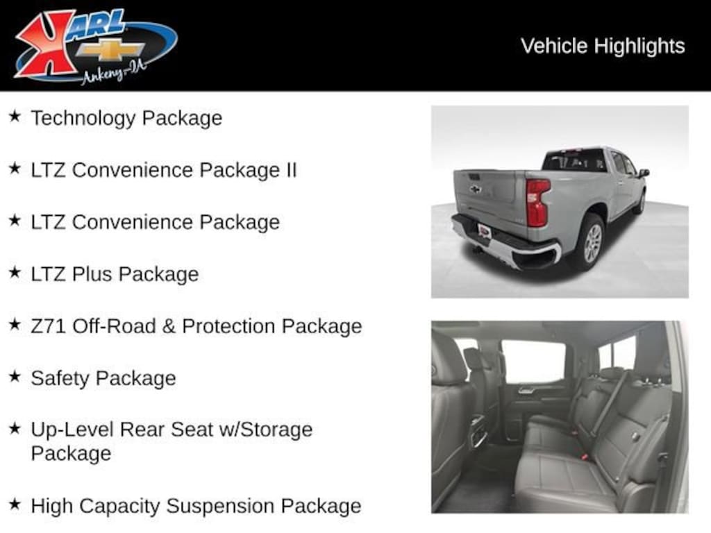 Factory MSRP: $68,580 $6,799 off MSRP! 10-Speed Automatic, 4WD, Jet Blk Perforated Lth-Ap Leather, 10-Way Power Passenger Seat Adjuster w/Lumbar, 120-Volt Bed Mounted Power Outlet, 120-Volt Interior Power Outlet, 15 Diagonal Multicolor Head-Up Display, 2 USB Data Ports, 2nd Row Heated Outboard Seats, ABS brakes, Adaptive Cruise Control, All-Weather Floor Liner (LPO) (AAK), Apple CarPlay/Android Auto, Auto-dimming Rear-View mirror, Bed View Camera, Bluetooth® For Phone, Brake assist, Chevytec Spray-On Black Bedliner, Deep-Tinted Glass, Dual Exhaust w/Black Exhaust Tips, Dual Exhaust w/Polished Outlets, Dual front impact airbags, Dual Rear USB Ports (Charge Only), Electric Rear-Window Defogger, Electronic Cruise Control, Electronic Stability Control, Electronic Transmission Range Selector Shifter, Floor Mounted Center Console, Forward Collision Alert, Front anti-roll bar, Front Black Bowtie Emblem (LPO), Front Bucket Seats, Front Center Armrest, Front dual zone A/C, Front Pedestrian Braking, Front reading lights, Front Rubberized Vinyl Floor Mats, HD Surround Vision, Heated door mirrors, Heated Driver & Front Outboard Passenger Seats, Heated front seats, Heated steering wheel, Heavy-Duty Air Filter, High Capacity Suspension Package, Hill Descent Control, Hitch Guidance, Illuminated entry, In-Vehicle Trailering System App, Lane Keep Assist w/Lane Departure Warning, LED Cargo Area Lighting, Low tire pressure warning, LTZ Convenience Package, LTZ Convenience Package II, LTZ Plus Package, Multi-Flex Tailgate, Occupant sensing airbag, Off-Road Suspension, OnStar Services Capable, Outside Heated Power-Adjustable Mirrors, Outside temperature display, Overhead console, Perforated Leather-Appointed Front Seat Trim, Perimeter Lighting, Power Front Passenger Windows w/Express Up/Down, Power Front Windows w/Driver Express Up/Down, Power Rear Windows w/Express Down, Power Sliding Rear Window w/Rear Defogger, Power steering, Power Tailgate, Power Tilt & Telescoping Steering Column, Premium audio system: Chevrolet Infotainment 3 Premium, Premium Bose 7-Speaker Sound System, Radio data system, Rear Camera Mirror, Rear Cross Traffic Braking, Rear Pedestrian Alert, Rear step bumper, Rear Wheelhouse Liners, Rear window defroster, Remote keyless entry, Remote Vehicle Starter System, Safety Alert Seat, Safety Package, SiriusXM w/360L Trial Subscription, Standard Tailgate, Technology Package, Teen Driver, Telescoping steering wheel, Trailer Camera Provisions, Trailer Side Blind Zone Alert, Trailering Package, Ultrasonic Front & Rear Park Assist, Universal Home Remote, Up-Level Rear Seat w/Storage Package, Ventilated Driver & Front Passenger Seats, Wheels: 20 x 9 Sterling Silver Painted Aluminum, Wi-Fi Hot Spot Capable, Wireless Charging, Z71 Off-Road & Protection Package, Z71 Off-Road Package.