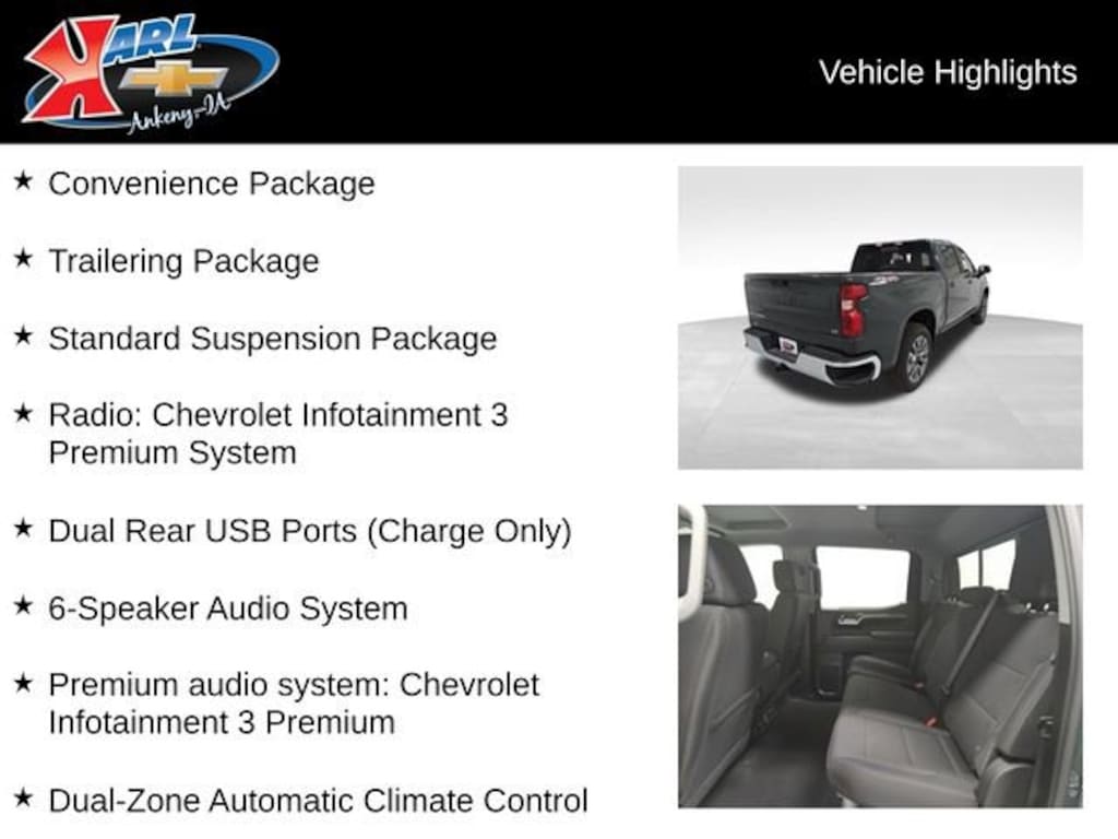 Factory MSRP: $57,305 $4,887 off MSRP! 8-Speed Automatic, 4WD, Black Cloth, 10-Way Power Driver Seat w/Lumbar, 12.3 Multicolor Reconfigurable Digital Display, 120-Volt Bed Mounted Power Outlet, 120-Volt Interior Power Outlet, 40/20/40 Front Split-Bench Seat, 6-Speaker Audio System, All-Star Edition, Apple CarPlay/Android Auto, Bumpers: chrome, Chrome Mirror Caps, Convenience Package, Dual Rear USB Ports (Charge Only), Dual-Zone Automatic Climate Control, Heated door mirrors, Heated Driver & Front Outboard Passenger Seats, Heated Steering Wheel, Hitch Guidance, Integrated Trailer Brake Controller, IntelliBeam Automatic High Beam On/Off, Keyless Open & Start, LED Cargo Area Lighting, Manual Tilt/Telescoping Steering Column, Power door mirrors, Premium audio system: Chevrolet Infotainment 3 Premium, Radio: Chevrolet Infotainment 3 Premium System, Rear 60/40 Folding Bench Seat (Folds Up), Rear step bumper, Split folding rear seat, Standard Suspension Package, Trailering Package, Wheels: 20 x 9 Painted Aluminum, Wrapped Steering Wheel.