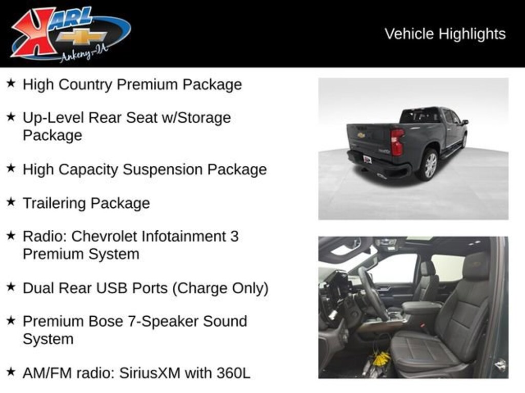 Factory MSRP: $72,435 $6,180 off MSRP! 10-Speed Automatic, 4WD, Black Leather, 10-Way Power Driver Seat w/Lumbar, 120-Volt Bed Mounted Power Outlet, 120-Volt Interior Power Outlet, 2nd Row Heated Outboard Seats, ABS brakes, Adaptive Cruise Control, All-Weather Floor Liner (LPO), AM/FM radio: SiriusXM with 360L, Auto-Dimming Inside Rear-View Mirror, Auto-dimming Rear-View mirror, Automatic temperature control, Bluetooth® For Phone, Brake assist, Chevytec Spray-On Black Bedliner, Delay-off headlights, Dual Exhaust w/Polished Outlets, Dual Rear USB Ports (Charge Only), Electric Rear-Window Defogger, Electronic Stability Control, Emergency communication system: OnStar, Floor Mounted Center Console, Following Distance Indicator, Forward Collision Alert, Front anti-roll bar, Front Carpeted Floor Mats, Front fog lights, Front LED Fog Lamps, Front Rain-Sensing Wipers, Front reading lights, Front wheel independent suspension, Fully automatic headlights, Genuine wood console insert, Genuine wood door panel insert, Heated Driver & Front Outboard Passenger Seats, Heated front seats, Heated Steering Wheel, High Capacity Suspension Package, High Country Premium Package, Hitch Guidance, Illuminated entry, IntelliBeam Automatic High Beam On/Off, Multi-Flex Tailgate, Outside Heated Power-Adjustable Mirrors, Outside temperature display, Overhead console, Power door mirrors, Power Front Passenger Windows w/Express Up/Down, Power passenger seat, Power Rear Windows w/Express Down, Power Sliding Rear Window w/Rear Defogger, Power Sunroof, Power Tailgate, Power Tilt & Telescoping Steering Column, Power windows, Premium audio system: Chevrolet Infotainment 3 Premium, Premium Bose 7-Speaker Sound System, Radio data system, Radio: Chevrolet Infotainment 3 Premium System, Rain sensing wipers, Rear Carpeted Floor Mats, Rear Pedestrian Alert, Rear step bumper, Rear Wheelhouse Liners, Rear window defroster, Remote Vehicle Starter System, Security system, Steering wheel mounted audio controls, Tachometer, Teen Driver, Trailering Package, Up-Level Rear Seat w/Storage Package, Ventilated Driver & Front Passenger Seats, Wheels: 20 x 9 Painted Aluminum, Wheels: 22 x 9 Painted Aluminum, Wi-Fi Hot Spot Capable.