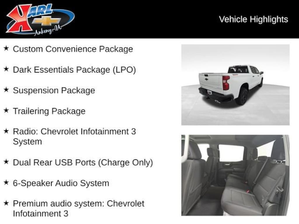 Factory MSRP: $58,895 $4,000 off MSRP! 10-Speed Automatic, 4WD, Jet Blk Clth Cloth, 120-Volt Bed Mounted Power Outlet, 120-Volt Interior Power Outlet, 3.5 Monochromatic Display Driver Info Center, 6-Speaker Audio System, ABS brakes, Air Conditioning, AM/FM radio: SiriusXM, Auto-Locking Rear Differential, Black Name Plates (LPO), Bluetooth® For Phone, Brake assist, Chevytec Spray-On Black Bedliner, Cloth Seat Trim, Color-Keyed Carpeting Floor Covering, Compass, Custom Convenience Package, Dark Essentials Package (LPO), Deep-Tinted Glass, Driver vanity mirror, Dual front side impact airbags, Dual Rear USB Ports (Charge Only), Electric Rear-Window Defogger, Electronic Stability Control, Emergency communication system: OnStar, EZ Lift Power Lock & Release Tailgate, Following Distance Indicator, Forward Collision Alert, Front Center Armrest w/Storage, Front Pedestrian Braking, Front reading lights, Front wheel independent suspension, HD Rear Vision Camera, Heated door mirrors, Heavy-Duty Air Filter, Hill Descent Control, Hitch Guidance, IntelliBeam Automatic High Beam On/Off, LED Cargo Area Lighting, Manual Tilt Wheel Steering Column, Multi-Flex Tailgate, Occupant sensing airbag, OnStar Services Capable, Overhead console, Power Front Windows w/Passenger Express Down, Power Rear Windows w/Express Down, Premium audio system: Chevrolet Infotainment 3, Radio: Chevrolet Infotainment 3 System, Rear reading lights, Rear Rubberized-Vinyl Floor Mats, Rear step bumper, Rear Wheelhouse Liners, Rear window defroster, Remote Keyless Entry, Remote Vehicle Starter System, Single Outlet Exhaust, Standard Tailgate, Suspension Package, Tachometer, Teen Driver, Theft Deterrent System (Unauthorized Entry), Tilt steering wheel, Trailering Package, Wheels: 18 x 8.5 Black Painted Aluminum, Wi-Fi Hot Spot Capable.Summit White 2026 Chevrolet Silverado 1500 Custom Trail Boss 4D Crew Cab EcoTec3 5.3L V8 10-Speed Automatic 4WD Price includes: $1000 - GM Bonus Cash. Exp. 11/03/2025 $2000 - Chevrolet Consumer Cash Program. Exp. 11/03/2025
