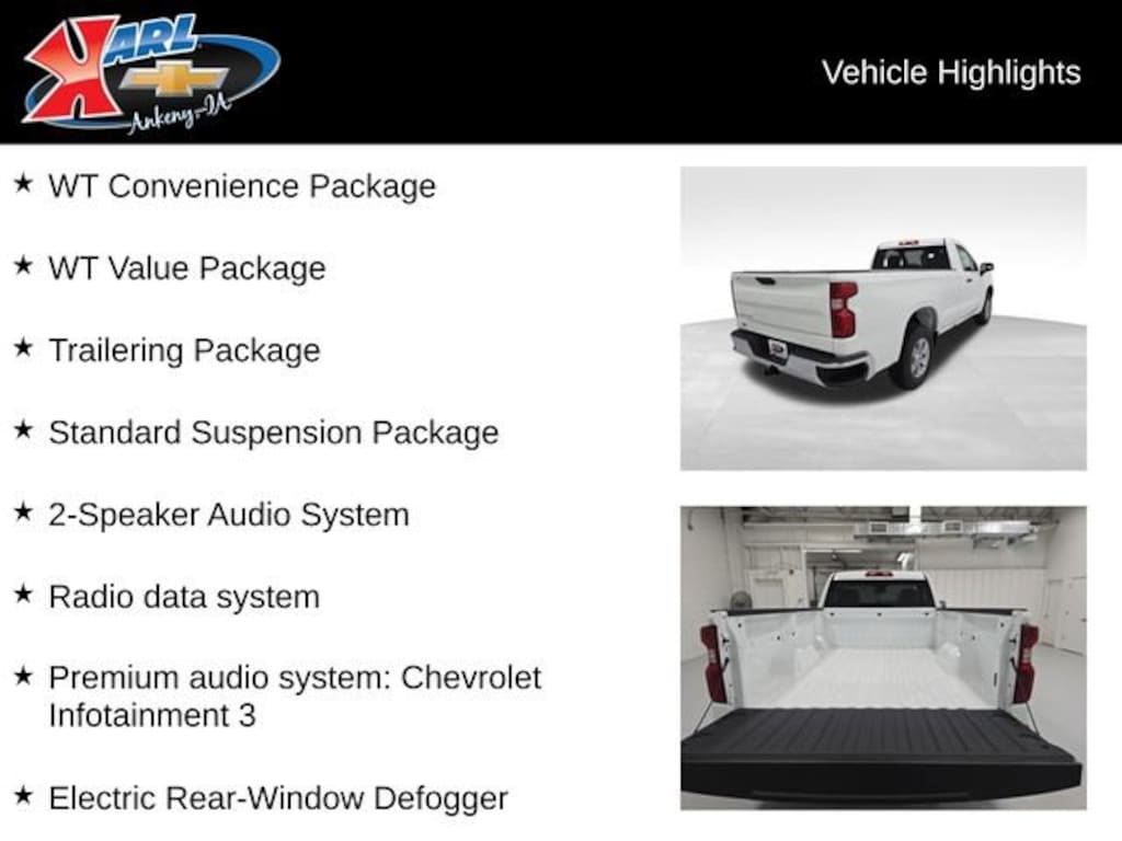 Factory MSRP: $42,950 $4,000 off MSRP! 10-Speed Automatic, Jet Blk Vinyl, 2-Speaker Audio System, 4-Wheel Disc Brakes, 40/20/40 Front Split Bench Seat, Air Conditioning, Brake assist, Compass, Deep-Tinted Glass, Delay-off headlights, Driver door bin, Dual front impact airbags, Electric Rear-Window Defogger, Electronic Stability Control, Emergency communication system: OnStar, Following Distance Indicator, Front anti-roll bar, Front Pedestrian Braking, Heated door mirrors, Hitch Guidance, IntelliBeam Automatic High Beam On/Off, Lane Keep Assist w/Lane Departure Warning, Low tire pressure warning, Occupant sensing airbag, Outside temperature display, Overhead airbag, Overhead console, Passenger vanity mirror, Power steering, Power windows, Premium audio system: Chevrolet Infotainment 3, Radio data system, Rear reading lights, Speed control, Standard Suspension Package, Trailering Package, Variably intermittent wipers, Vinyl Seat Trim, Wheels: 17 x 8 Ultra Silver Painted Steel, WT Convenience Package, WT Value Package.Summit White 2026 Chevrolet Silverado 1500 WT 2D Standard Cab EcoTec3 5.3L V8 10-Speed Automatic RWD Price includes: $1000 - GM Bonus Cash. Exp. 11/03/2025 $2000 - Chevrolet Consumer Cash Program. Exp. 11/03/2025