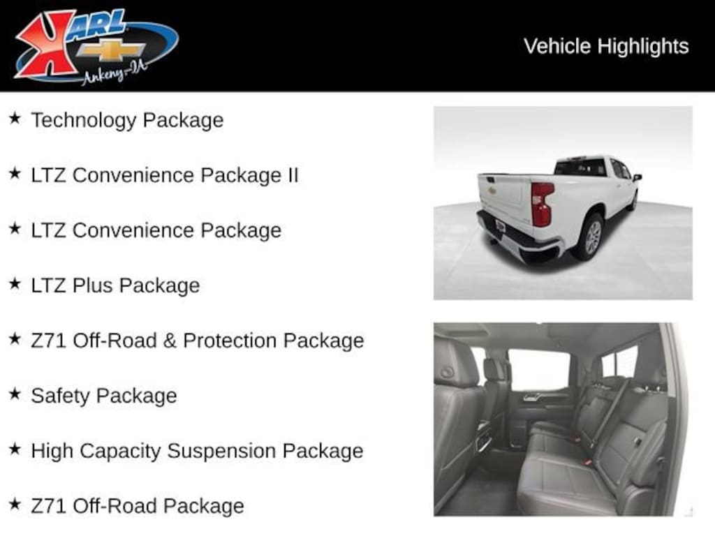 Factory MSRP: $69,280 $6,351 off MSRP! 10-Speed Automatic, 4WD, Black Leather, 120-Volt Bed Mounted Power Outlet, 120-Volt Interior Power Outlet, 15 Diagonal Multicolor Head-Up Display, 2 USB Data Ports, 2nd Row Heated Outboard Seats, Adaptive Cruise Control, All-Weather Floor Liner (LPO) (AAK), Bed View Camera, Bluetooth® For Phone, Brake assist, Chevytec Spray-On Black Bedliner, Deep-Tinted Glass, Dual Exhaust w/Black Exhaust Tips, Dual Exhaust w/Polished Outlets, Dual Rear USB Ports (Charge Only), Electric Rear-Window Defogger, Electronic Stability Control, Electronic Transmission Range Selector Shifter, Floor Mounted Center Console, Forward Collision Alert, Front Center Armrest, Front dual zone A/C, Front LED Fog Lamps, Front Pedestrian Braking, Front Rain-Sensing Wipers, Front reading lights, HD Surround Vision, Heated Driver & Front Outboard Passenger Seats, Heated front seats, Heated steering wheel, Heavy-Duty Air Filter, High Capacity Suspension Package, Hill Descent Control, Hitch Guidance, Hitch Guidance w/Hitch View, Illuminated entry, In-Vehicle Trailering System App, IntelliBeam Automatic High Beam On/Off, Lane Keep Assist w/Lane Departure Warning, LED Cargo Area Lighting, LTZ Convenience Package, LTZ Convenience Package II, LTZ Plus Package, Multi-Flex Tailgate, Off-Road Suspension, OnStar Services Capable, Outside Heated Power-Adjustable Mirrors, Outside temperature display, Perforated Leather-Appointed Front Seat Trim, Perimeter Lighting, Power driver seat, Power Front Passenger Windows w/Express Up/Down, Power Sliding Rear Window w/Rear Defogger, Power steering, Power Tailgate, Power Tilt & Telescoping Steering Column, Power windows, Premium audio system: Chevrolet Infotainment 3 Premium, Premium Bose 7-Speaker Sound System, Radio: Chevrolet Infotainment 3 Premium System, Rain sensing wipers, Rear Camera Mirror, Rear Cross Traffic Braking, Rear Pedestrian Alert, Remote Vehicle Starter System, Safety Alert Seat, Safety Package, Split folding rear seat, Steering wheel mounted audio controls, Technology Package, Trailer Camera Provisions, Trailer Side Blind Zone Alert, Trailering Package, Ultrasonic Front & Rear Park Assist, Universal Home Remote, Ventilated Driver & Front Passenger Seats, Wheels: 20 x 9 Sterling Silver Painted Aluminum, Wi-Fi Hot Spot Capable, Wireless Charging, Z71 Off-Road & Protection Package, Z71 Off-Road Package.