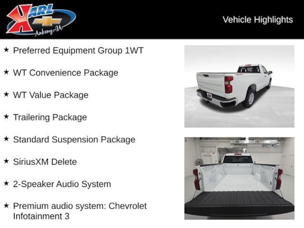 Factory MSRP: $44,605 $5,914 off MSRP! Priced below KBB Fair Purchase Price! 8-Speed Automatic, 4WD, Jet Black Vinyl, 2-Speaker Audio System, 3.5 Monochromatic Display Driver Info Center, 4-Way Manual Driver Seat Adjuster, Black (Semi-Gloss) Front Bumper, Black (Semi-Gloss) Rear Bumper, Bluetooth® For Phone, Deep-Tinted Glass, Dual front impact airbags, Dual front side impact airbags, Electric Rear-Window Defogger, Electronic Cruise Control, Electronic Stability Control, Emergency communication system: OnStar, Following Distance Indicator, Forward Collision Alert, Front Chrome Bumper, Front Frame-Mounted Black Recovery Hooks, Front License Plate Kit, Front Pedestrian Braking, HD Rear Vision Camera, Heated Power-Adjustable Outside Mirrors, Hitch Guidance, Locking Tailgate, Manual Tilt Wheel Steering Column, OnStar Services Capable, Preferred Equipment Group 1WT, Premium audio system: Chevrolet Infotainment 3, Radio data system, Remote Keyless Entry, Rubberized-Vinyl Floor Covering, SiriusXM Delete, Solar Absorbing Tinted Glass, Speed control, Standard Suspension Package, Standard Tailgate, Teen Driver, Tire Pressure Monitoring System, Trailering Package, Wheels: 17 x 8 Ultra Silver Painted Steel, Wi-Fi Hot Spot Capable, WT Convenience Package, WT Value Package.