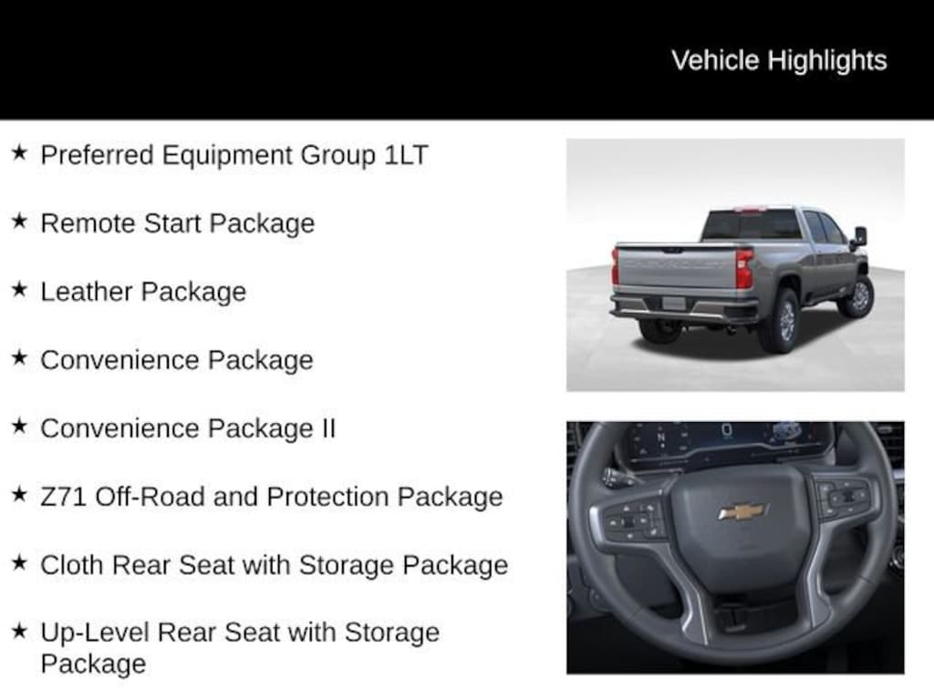- Custom Features: Cloth Rear Seat with Storage Package, Convenience Package, Convenience Package II, Heat Package, Leather Package, Preferred Equipment Group 1LT, Protection Package, Remote Start Package, Snow Plow Prep/Camper Package, Suspension Package, Up-Level Rear Seat with Storage Package, Z71 Off-Road and Protection Package, Z71 Off-Road Package