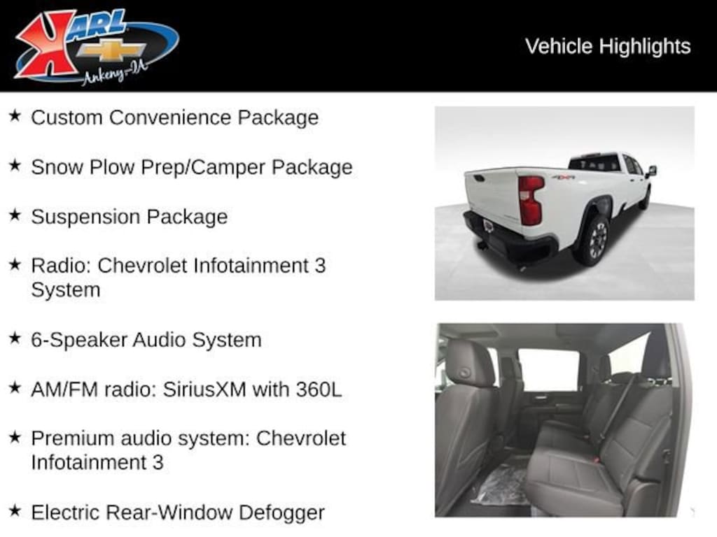Factory MSRP: $58,410 $2,257 off MSRP! 10-Speed Automatic, 4WD, Jet Blk Clth Cloth, 120-Volt Bed Mounted Power Outlet, 120-Volt Interior Power Outlet, 220 Amp Alternator, 6-Speaker Audio System, ABS brakes, Air Conditioning, AM/FM radio: SiriusXM with 360L, Black Mirror Caps, Brake assist, Cloth Seat Trim, Color-Keyed Carpeting Floor Covering, Compass, Custom Convenience Package, Deep-Tinted Glass, Dual front impact airbags, Dual front side impact airbags, Durabed Pickup Bed, Electric Rear-Window Defogger, Electronic Stability Control, Front reading lights, Front Rubberized Vinyl Floor Mats, Front wheel independent suspension, HD Rear Vision Camera, Heated door mirrors, LED Cargo Area Lighting, Locking Tailgate, OnStar Services Capable, Outside temperature display, Overhead airbag, Passenger vanity mirror, Power Door Locks, Power steering, Premium audio system: Chevrolet Infotainment 3, Push Button Start, Radio: Chevrolet Infotainment 3 System, Rear reading lights, Rear Rubberized Vinyl Floor Mats, Rear step bumper, Remote Keyless Entry, Remote Vehicle Starter System, Snow Plow Prep/Camper Package, Standard Tailgate, Suspension Package, Tilt steering wheel, Turn signal indicator mirrors, Unauthorized Entry Theft-Deterrent System, Wheels: 20 10-Spoke Machined Aluminum, Wi-Fi Hotspot Capable, Wireless Phone Projection.