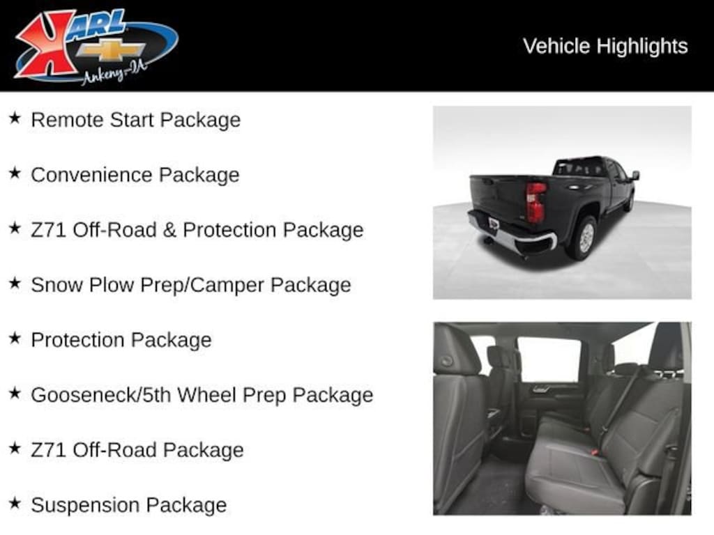 Factory MSRP: $63,215 $4,090 off MSRP! 10-Speed Automatic, 4WD, Black Cloth, 10-Way Power Driver Seat Adjuster w/Lumbar, 1st & 2nd Row All-Weather Floor Liners (LPO) (AAK), 2 Charge/Data USB Ports Inside Center Console, 220 Amp Alternator, 6-Speaker Audio System, Apple CarPlay/Android Auto, Black Chevytec Spray-On Bedliner, Black Mirror Caps, Bumpers: chrome, Convenience Package, Dual-Zone Automatic Climate Control, Electric Rear-Window Defogger, Floor-Mounted Center Console, Front Bucket Seats, Front LED Fog Lamps, Gooseneck/5th Wheel Prep Package, Halogen Reflector Headlamps, Heat Package, Heated door mirrors, Heated Driver & Front Outboard Passenger Seating, Heated Steering Wheel, Heated Vertical Trailering Mirrors, Hill Descent Control, LED Cargo Area Lighting, LED Smoked Amber Roof Marker Lamps, Manual Tilt & Telescoping Steering Column, Off-Road Suspension, Premium audio system: Chevrolet Infotainment 3 Premium, Protection Package, Radio: Chevrolet Infotainment 3 Premium System, Rear 60/40 Folding Bench Seat (Folds Up), Rear Wheelhouse Liners, Remote Start Package, Remote Vehicle Starter System, Snow Plow Prep/Camper Package, Split folding rear seat, Suspension Package, Unauthorized Entry Theft-Deterrent System, Wheels: 18 Machined Alum w/Silver Painted Accents, Wireless Charging, Z71 Off-Road & Protection Package, Z71 Off-Road Package.Black 2026 Chevrolet Silverado 2500HD LT 4D Crew Cab 6.6L V8 10-Speed Automatic 4WD Price includes: $1000 - Chevrolet Consumer Cash Program. Exp. 11/03/2025