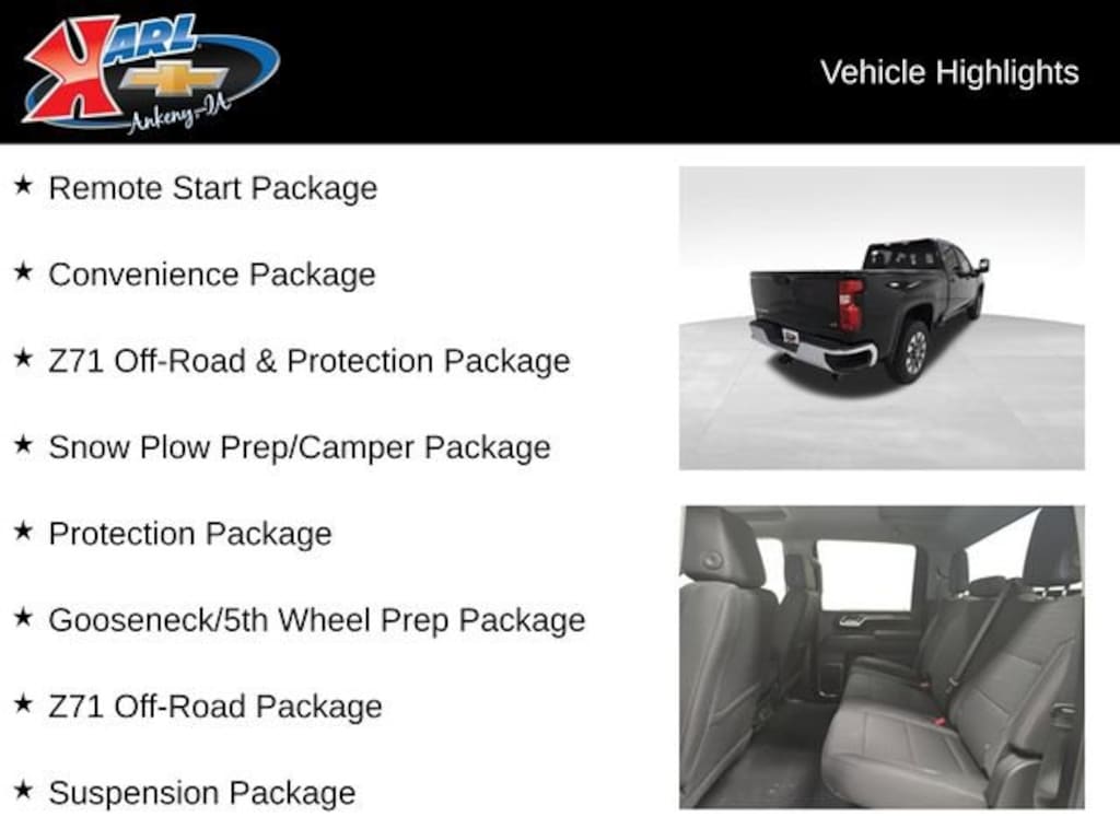 Factory MSRP: $63,560 $4,116 off MSRP! 10-Speed Automatic, 4WD, Black Cloth, 10-Way Power Driver Seat Adjuster w/Lumbar, 120-Volt Interior Power Outlet, 1st & 2nd Row All-Weather Floor Liners (LPO) (AAK), 2-Speed Electronic Shift Transfer Case, 220 Amp Alternator, 4-Way Manual Driver Seat Adjuster, 6-Speaker Audio System, Air Conditioning, AM/FM radio: SiriusXM with 360L, Apple CarPlay/Android Auto, Black Chevytec Spray-On Bedliner, Black Mirror Caps, Bluetooth® For Phone, Brake assist, Chevrolet Connected Access Capable, Cloth Seat Trim, Convenience Package, Deep-Tinted Glass, Driver door bin, Driver vanity mirror, Dual front impact airbags, Dual-Zone Automatic Climate Control, Durabed Pickup Bed, Electric Rear-Window Defogger, Electronic Cruise Control w/Set & Resume Speed, Electronic Stability Control, Emergency communication system: OnStar, EZ Lift Power Lock & Release Tailgate, Front 40/20/40 Split-Bench Seats w/Lockable Storage, Front LED Fog Lamps, Front Rubberized Vinyl Floor Mats, Gooseneck/5th Wheel Prep Package, Halogen Reflector Headlamps, Heat Package, Heated Driver & Front Outboard Passenger Seating, Heated Steering Wheel, Hill Descent Control, LED Cargo Area Lighting, Manual Tilt & Telescoping Steering Column, Occupant sensing airbag, Off-Road Suspension, Outside temperature display, Overhead airbag, Power Front Windows w/Passenger Express Down, Power Rear Windows w/Express Down, Power steering, Power windows, Premium audio system: Chevrolet Infotainment 3 Premium, Protection Package, Push Button Start, Rear 60/40 Folding Bench Seat (Folds Up), Rear Rubberized Vinyl Floor Mats, Rear Wheelhouse Liners, Remote keyless entry, Remote Start Package, Remote Vehicle Starter System, SiriusXM w/360L Trial Subscription, Snow Plow Prep/Camper Package, Standard Tailgate, Steering Wheel Audio Controls, Suspension Package, Unauthorized Entry Theft-Deterrent System, Wheels: 18 Machined Alum w/Silver Painted Accents, Wi-Fi Hotspot Capable, Wireless Phone Projection, Z71 Off-Road & Protection Package, Z71 Off-Road Package.Black 2026 Chevrolet Silverado 2500HD LT 4D Crew Cab 6.6L V8 10-Speed Automatic 4WD Price includes: $1000 - Chevrolet Consumer Cash Program. Exp. 11/03/2025