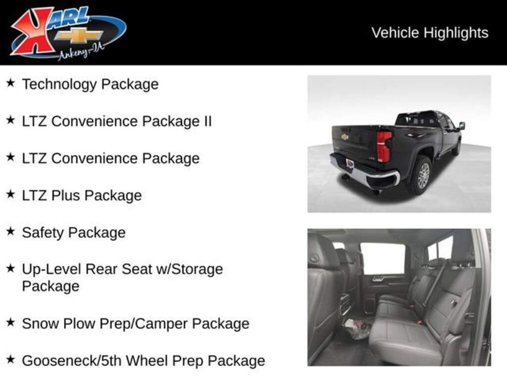 Factory MSRP: $82,105 $4,328 off MSRP! 10-Speed Automatic, 4WD, Jet Blk Perforated Lth-Ap Leather, 120-Volt Bed Mounted Power Outlet, 120-Volt Interior Power Outlet, 15 Diagonal Multicolor Head-Up Display, 2 Charge/Data USB Ports Inside Center Console, 220 Amp Alternator, Adaptive Cruise Control, Air Conditioning, AM/FM radio: SiriusXM with 360L, Auto-Dimming Inside Rear-View Mirror, Automatic temperature control, BOSE Premium 7-Speaker Sound System, Chevrolet Connected Access Capable, Color-Keyed Carpeting Floor Covering, Deep-Tinted Glass, Driver Memory, Dual front impact airbags, Dual front side impact airbags, Durabed Pickup Bed, Electric Rear-Window Defogger, Electronic Stability Control, Floor-Mounted Center Console, Front anti-roll bar, Front Bucket Seats, Front Center Armrest w/Storage, Front dual zone A/C, Front fog lights, Front Rubberized Vinyl Floor Mats, Gooseneck/5th Wheel Prep Package, HD Rear Vision Camera, HD Surround Vision, Heated 2nd Row Outboard Seats, Heated front seats, Heated steering wheel, Hill Descent Control, LED Cargo Area Lighting, Low tire pressure warning, LTZ Convenience Package, LTZ Convenience Package II, LTZ Plus Package, Memory seat, Multi-Flex Tailgate, Occupant sensing airbag, Off-Road Suspension, OnStar Services Capable, Outside temperature display, Overhead airbag, Overhead console, Power door mirrors, Power driver seat, Power passenger seat, Power steering, Power windows, Premium audio system: Chevrolet Infotainment 3 Premium, Push Button Start, Rear Camera Mirror, Rear Cross Traffic Alert, Rear Rubberized Vinyl Floor Mats, Rear window defroster, Remote keyless entry, Remote Vehicle Starter System, Safety Alert Seat, Safety Package, Snow Plow Prep/Camper Package, Standard Tailgate, Steering Wheel Audio Controls, Suspension Package, Technology Package, Traction control, Trailer Camera Provisions, Trailer Side Blind Zone Alert, Turn signal indicator mirrors, Universal Home Remote, Wi-Fi Hotspot Capable, Wireless Charging, Wireless Phone Projection, Z71 Off-Road Package.