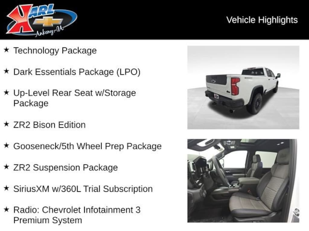 Factory MSRP: $99,490 $5,374 off MSRP! 10-Speed Automatic, 4WD, Jet Black/Graystone Leather, 120-Volt Interior Power Outlet, 15 Diagonal Multicolor Head-Up Display, 170 Amp Alternator, 3 Years OnStar One, 7 Speakers, AEV Front Bumper, AEV Rear Bumper, Air Conditioning, AM/FM radio: SiriusXM with 360L, Apple CarPlay/Android Auto, Auto-dimming Rear-View mirror, Automatic temperature control, Bluetooth® For Phone, BOSE Premium 7-Speaker Sound System, Chevrolet Connected Access Capable, Color-Keyed Carpeting Floor Covering, Compass, Deep-Tinted Glass, Delay-off headlights, Driver Memory, Dual front impact airbags, Dual front side impact airbags, Durabed Pickup Bed, Electric Rear-Window Defogger, Electronic Stability Control, Front AEV Brand Floor Liners (LPO), Front anti-roll bar, Front Center Armrest, Front dual zone A/C, Front Rain-Sensing Wipers, Garage door transmitter, Gooseneck/5th Wheel Prep Package, Heated 2nd Row Outboard Seats, Heated door mirrors, Heated rear seats, Heated Steering Wheel, Heated steering wheel, High Gloss Black Mirror Caps, LED Cargo Area Lighting, LED Smoked Amber Roof Marker Lamps, Low tire pressure warning, Memory seat, Multi-Flex Tailgate, OnStar Services Capable, Passenger vanity mirror, Perforated Leather Seat Trim, Power passenger seat, Power steering, Power Sunroof, Power windows, Power-Retractable Black Assist Steps, Push Button Start, Radio: Chevrolet Infotainment 3 Premium System, Rain sensing wipers, Rear Camera Mirror, Rear Cross Traffic Alert, Rear reading lights, Rear step bumper, Remote Vehicle Starter System, Technology Package, Ventilated front seats, Wi-Fi Hotspot Capable, Wireless Charging, Wireless Phone Projection, ZR2 Bison Edition, ZR2 Suspension Package.