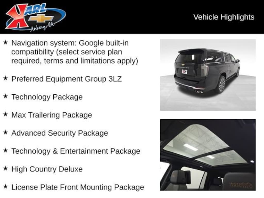Factory MSRP: $98,080 15 Diagonal Multi-Color Head-Up Display, 2-Speed Active Electronic AutoTrac Transfer Case, 3rd Row 60/40 Power-Folding Split-Bench, 3rd row seats: split-bench, 4-Way Power Driver Lumbar Seat Adjuster, 4-Way Power Front Passenger Lumbar Seat Adjuster, 8-Way Power Front Passenger Seat Adjuster, Advanced Security Package, Advanced Trailering Package, Air Ride Adaptive Suspension, AutoSense Hands-Free Power Liftgate, Blind Zone Steering Assist w/Trailering, Bose 10-Speaker Surround w/CenterPoint, Bright Front & Rear Door Sill Plates, Chrome Door Handles w/Body-Color Strip, Dual Exhaust System, Dual-Pane Power Panoramic Sunroof, Extra Capacity Cooling System, Front Bucket Seats, Front Center Armrest, Front LED Fog Lamps, Glass Breakage Sensor, Heated 2nd Row Outboard Seats, Heated Driver & Front Passenger Seats, Heated front seats, Heated Power-Adjustable Outside Mirrors, Heated rear seats, Heated Steering Wheel, High Country Deluxe, Hill Descent Control, Hitch View w/Pan/Zoom Image Adjustment, Inside Rearview Auto-Dimming Rear Camera Mirror, Integrated Trailer Brake Controller, Interior Camera, LED Headlamps w/LED Daytime Running Lamps, LED Tail Lamps, License Plate Front Mounting Package, Max Trailering Package, Memory Settings, Navigation system: Google built-in compatibility (select service plan required, terms and limitations apply), Perforated Heated & Ventilated Seats, Perforated Leather Seating Surfaces, Power passenger seat, Power Release 2nd Row Bucket Seats, Power Tilt & Telescopic Steering Column, Power-Retractable Assist Steps, Power-Sliding Center Floor Console, Preferred Equipment Group 3LZ, Radio: 17.7 Diagonal Advanced Color LCD Display, Rear Power Liftgate, Rear Seat Media System, Self-Powered Horn Theft-Deterrent Alarm System, SiriusXM w/360L Trial Subscription, Smart Trailer Integration Indicator, Split folding rear seat, Technology & Entertainment Package, Technology Package, Universal Home Remote, Vehicle Inclination Sensor, Vehicle Interior Movement Sensor, Ventilated front seats, Wheel Locks (Set of 4) (LPO), Wheels: 22 x 9 Bright Machined Alum., Wireless Apple CarPlay/Wireless Android Auto, Wireless Phone Charging.