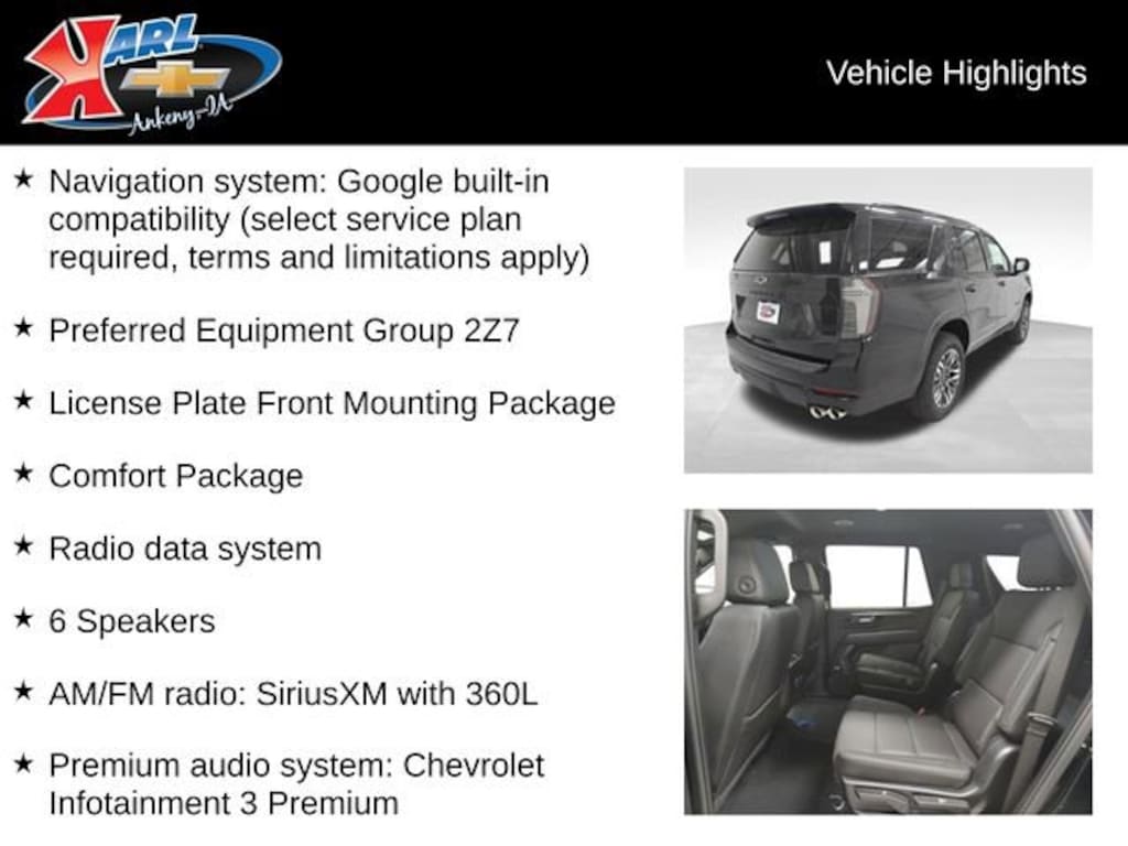 Factory MSRP: $76,220 $1,000 off MSRP! 4WD, Black Leather, 2-Speed Active Electronic AutoTrac Transfer Case, 3-Spoke Wrapped Steering Wheel, 3rd Row 60/40 Power-Folding Split-Bench Seat, 3rd Row Manual 60/40 Split-Folding Bench Seats, 6 Speakers, 8-Way Power Front Passenger Seat Adjuster, ABS brakes, Air Conditioning, AM/FM radio: SiriusXM with 360L, Auto-Dimming Inside Rear-View Mirror, Automatic temperature control, Black Tubular Assist Steps, Brake assist, Color-Keyed Carpeting Floor Covering, Comfort Package, Dual Exhaust System, Dual front side impact airbags, Electronic Stability Control, Exterior Parking Camera Rear, Front dual zone A/C, Front High-Approach Angle Fascia, Front LED Fog Lamps, Heated 2nd Row Outboard Seats, Heated front seats, Heated Steering Wheel, Hill Descent Control, Interior Camera, Key Card, LED Tail Lamps, License Plate Front Mounting Package, Memory seat, Memory Settings, Navigation system: Google built-in compatibility (select service plan required, terms and limitations apply), Occupant sensing airbag, Outside Heated Power-Adjustable Mirrors, Overhead airbag, Power driver seat, Power Liftgate, Power passenger seat, Power Release 2nd Row Bucket Seats, Power windows, Preferred Equipment Group 2Z7, Premium audio system: Chevrolet Infotainment 3 Premium, Premium Smooth Ride Suspension, Radio data system, Rear air conditioning, Rear Power Liftgate, Red Horizontal-Mounted Recovery Hooks, Remote keyless entry, Remote Start, Speed-sensing steering, Universal Home Remote, USB Ports, Wireless Phone Charging, Z71 Exterior Features.
