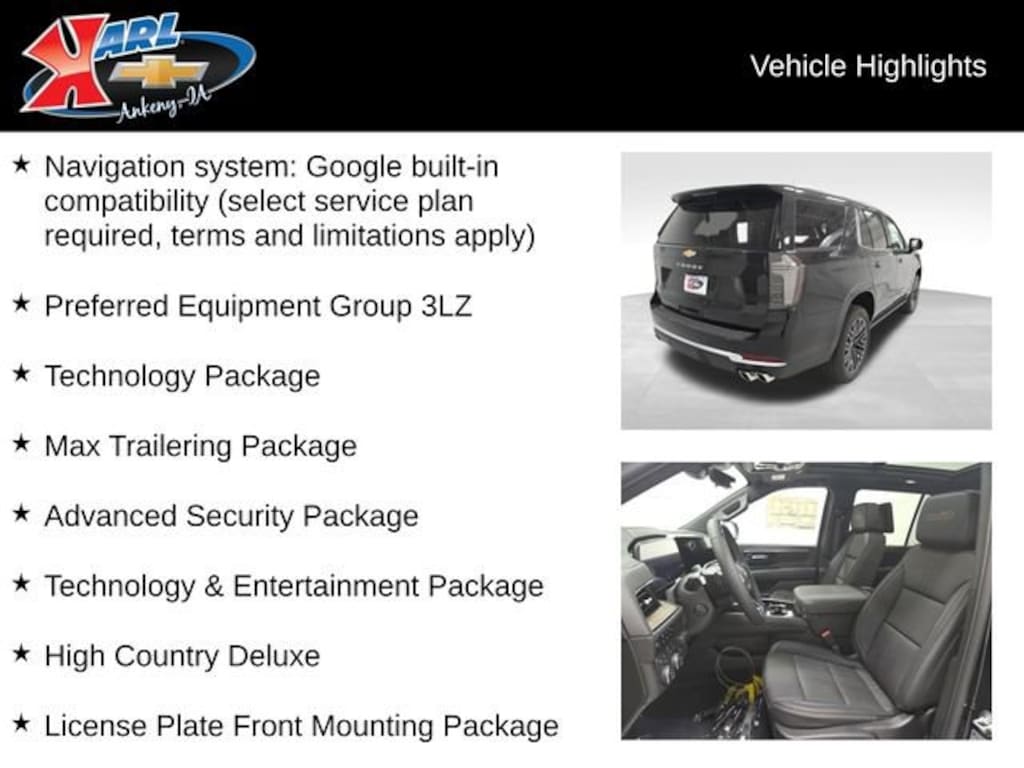 Factory MSRP: $98,075 $3,159 off MSRP! 4WD, Black Leather, 15 Diagonal Multi-Color Head-Up Display, 2-Speed Active Electronic AutoTrac Transfer Case, 3-Spoke Wrapped Steering Wheel, 3rd Row 60/40 Power-Folding Split-Bench Seat, 3rd row seats: split-bench, 4-Way Power Front Passenger Lumbar Seat Adjuster, Advanced Security Package, Advanced Trailering Package, Air Ride Adaptive Suspension, Apple CarPlay/Android Auto, AutoSense Hands-Free Power Liftgate, Color-Keyed Carpeting Floor Covering, Dual Exhaust System, Dual-Pane Power Panoramic Sunroof, Floor Console, Front Bucket Seats, Front Center Armrest, Front LED Fog Lamps, Glass Breakage Sensor, Heated 2nd Row Outboard Seats, Heated rear seats, Heated Steering Wheel, High Country Deluxe, Hill Descent Control, Integrated Trailer Brake Controller, Interior Camera, Key Card, LED Tail Lamps, License Plate Front Mounting Package, Max Trailering Package, Memory Settings, Navigation system: Google built-in compatibility (select service plan required, terms and limitations apply), Outside Heated Power-Adjustable Mirrors, Perforated Leather Seat Trim, Power passenger seat, Power Release 2nd Row Bucket Seats, Power-Retractable Assist Steps, Preferred Equipment Group 3LZ, Premium audio system: Chevrolet Infotainment 3 Premium, Radio: 17.7 Diagonal Advanced Color LCD Display, Rear Power Liftgate, Rear Seat Media System, Remote Start, Smart Trailer Integration Indicator, Split folding rear seat, Technology & Entertainment Package, Technology Package, Theft-Deterrent Alarm System, Universal Home Remote, Vehicle Inclination Sensor, Vehicle Interior Movement Sensor, Wireless Phone Charging.