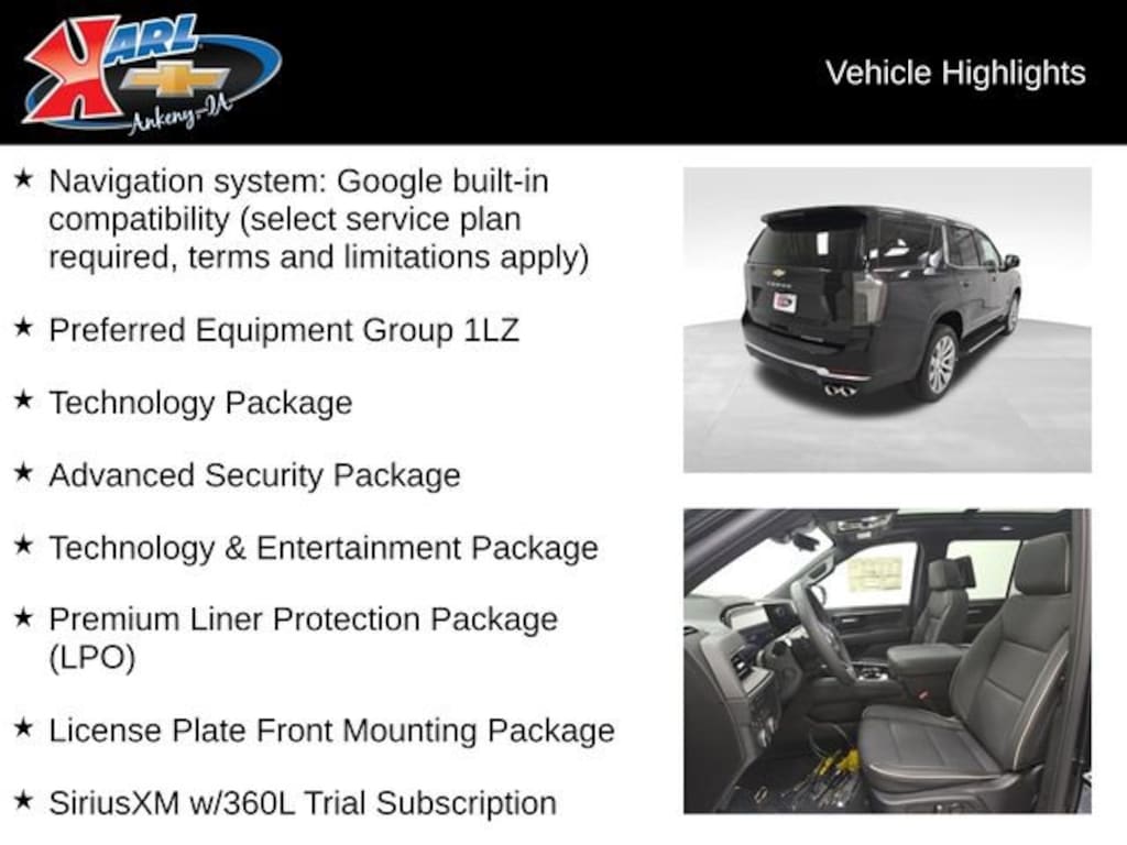 Factory MSRP: $87,935 $1,500 off MSRP! 4WD, Black Leather, 15 Diagonal Multi-Color Head-Up Display, 1st & 2nd Row Color-Keyed Carpeted Floor Mats, 1st & 2nd Rows Premium Floor Liners (LPO), 3-Spoke Wrapped Steering Wheel, 3rd Row 60/40 Power-Folding Split-Bench Seat, 3rd Row All-Weather Floor Liners (LPO), 3rd row seats: split-bench, 4-Way Power Front Passenger Lumbar Seat Adjuster, Advanced Security Package, All-Weather Cargo Mat (LPO), Apple CarPlay/Android Auto, Auto-Dimming Inside Rear-View Mirror, AutoSense Hands-Free Power Liftgate, Bose 10-Speaker Centerpoint Surround Audio Sys Ft, Bright Front & Rear Door Sill Plates, Chrome Door Handles w/Body-Color Strip, Chrome Mirror Caps, Color-Keyed Carpeting Floor Covering, Driver & Front Passenger Heated & Ventilated Seats, Dual Exhaust System, Dual-Pane Power Panoramic Sunroof, Floor Console, Front Bucket Seats, Front Center Armrest, Front LED Fog Lamps, Frontal Driver & Outboard Passenger Airbags, Glass Breakage Sensor, Heated 2nd Row Outboard Seats, Heated Driver & Front Passenger Seats, Heated rear seats, Heated Steering Wheel, Inside Rearview Auto-Dimming Rear Camera Mirror, Interior Camera, Key Card, LED Headlamps w/LED Daytime Running Lamps, LED Tail Lamps, License Plate Front Mounting Package, Memory Settings, Navigation system: Google built-in compatibility (select service plan required, terms and limitations apply), Outside Heated Power-Adjustable Mirrors, Perforated Leather Seat Trim, Power passenger seat, Power Release 2nd Row Bucket Seats, Power Tilt & Telescopic Steering Column, Preferred Equipment Group 1LZ, Premium audio system: Chevrolet Infotainment 3 Premium, Premium Liner Protection Package (LPO), Radio: 17.7 Diagonal Advanced Color LCD Display, Rear Power Liftgate, Rear Seat Media System, Remote Start, Set of 4 Wheel Locks (LPO), SiriusXM w/360L Trial Subscription, Split folding rear seat, Technology & Entertainment Package, Technology Package, Theft-Deterrent Alarm System, Universal Home Remote, Vehicle Inclination Sensor, Vehicle Interior Movement Sensor, Ventilated front seats, Wheels: 22 x 9 Manoogian Silver Painted Aluminum, Wireless Phone Charging.