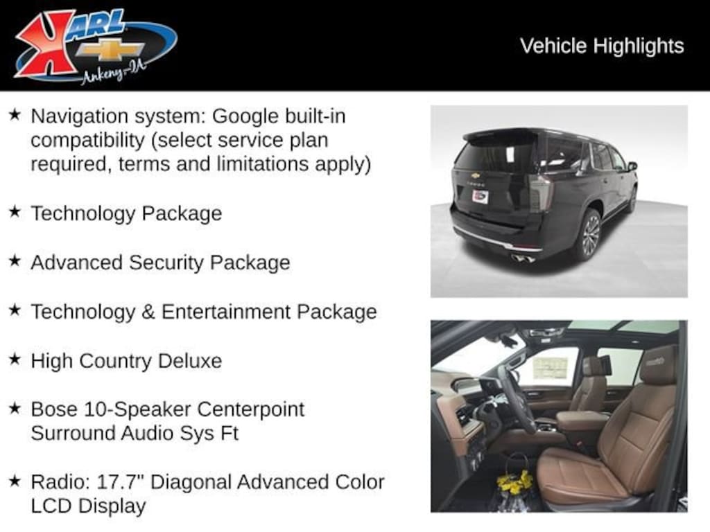 Factory MSRP: $95,379 4WD, Jet Blk/Mocha Perforated Leather, 15 Diagonal Multi-Color Head-Up Display, 3rd Row 60/40 Power-Folding Split-Bench Seat, 3rd row seats: split-bench, 4-Way Power Front Passenger Lumbar Seat Adjuster, Advanced Security Package, Air Ride Adaptive Suspension, Apple CarPlay/Android Auto, AutoSense Hands-Free Power Liftgate, Bose 10-Speaker Centerpoint Surround Audio Sys Ft, Driver & Front Passenger Heated & Ventilated Seats, Dual-Pane Power Panoramic Sunroof, Front Bucket Seats, Front Center Armrest, Glass Breakage Sensor, Heated 2nd Row Outboard Seats, Heated Driver & Front Passenger Seats, Heated rear seats, High Country Deluxe, Navigation system: Google built-in compatibility (select service plan required, terms and limitations apply), Perforated Leather Seat Trim, Power Liftgate, Power passenger seat, Power Release 2nd Row Bucket Seats, Power-Retractable Assist Steps, Premium audio system: Chevrolet Infotainment 3 Premium, Radio: 17.7 Diagonal Advanced Color LCD Display, Rear Seat Media System, Set of 4 Wheel Locks (LPO), Split folding rear seat, Technology & Entertainment Package, Technology Package, Theft-Deterrent Alarm System, Vehicle Inclination Sensor, Vehicle Interior Movement Sensor, Ventilated front seats, Wheels: 22 x 9 Bright Machined Aluminum.