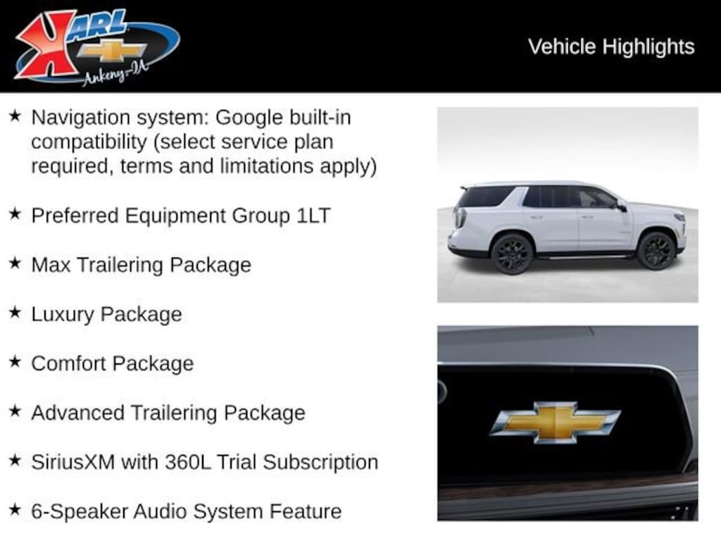 At Karl Chevrolet we want to help you find the best new or used car in Ankeny that suits your needs. When you buy a new car at Karl Chevrolet you know you're finding a vehicle you can rely on. We have a great selection of Platinum Quality Pre-Owned Vehicles. We also pride ourselves in creating a friendly atmosphere and a reliable Dealership that you can trust. Call us and our experts will be glad to help you! (515) 299-4300. *Equipment and options are generated by a 3rd party vendor, exact vehicle options may vary. Please see a salesperson for complete details and vehicle information.