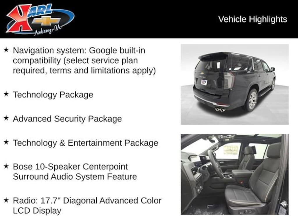 Factory MSRP: $89,410 4WD, Black Leather, 15 Diagonal Multi-Color Head-Up Display, 1st and 2nd Row Color-Keyed Carpeted Floor Mats, 20 x 9 Polished Aluminum Wheels, 3rd Row 60/40 Power-Folding Split-Bench Seat, 4-Way Power Driver Lumbar Seat Adjuster, 4-Way Power Front Passenger Lumbar Seat Adjuster, 8-Way Power Driver Seat Adjuster, 8-Way Power Front Passenger Seat Adjuster, ABS brakes, Adaptive suspension, Advanced Security Package, Air Conditioning, AM/FM radio: SiriusXM with 360L, Apple CarPlay/Android Auto, Auto-Dimming Inside Rear-View Mirror, Automatic temperature control, AutoSense Hands-Free Power Liftgate, Bose 10-Speaker Centerpoint Surround Audio System Feature, Bright Front and Rear Door Sill Plates, Chrome Door Handles with Body-Color Strip, Chrome Mirror Caps, Color-Keyed Carpeting Floor Covering, Compass, Driver and Front Passenger Heated and Ventilated Seats, Driver vanity mirror, Dual Exhaust System, Dual front impact airbags, Dual front side impact airbags, Dual-Pane Power Panoramic Sunroof, Electronic Stability Control, Exterior Parking Camera Rear, Four wheel independent suspension, Front Center Armrest, Front dual zone A/C, Front LED Fog Lamps, Front reading lights, Glass Breakage Sensor, Heated 2nd Row Outboard Seats, Heated door mirrors, Heated Driver and Front Passenger Seats, Heated front seats, Heated Steering Wheel, Inside Rearview Auo-Dimming Rear Camera Mirror, Key Card, LED Headlamps with LED Daytime Running Lamps, Low tire pressure warning, Magnetic Ride Control Suspension, Memory Settings, Navigation system: Google built-in compatibility (select service plan required, terms and limitations apply), Outside temperature display, Overhead airbag, Overhead console, Power door mirrors, Power Liftgate, Power Release 2nd Row Bucket Seats, Power Tilt and Telescopic Steering Column, Power windows, Premium audio system: Chevrolet Infotainment 3 Premium, Radio data system, Radio: 17.7 Diagonal Advanced Color LCD Display, Rain sensing wipers, Rear air conditioning, Rear anti-roll bar, Rear Power Liftgate, Rear reading lights, Rear Seat Media System, Rear window wiper, Remote keyless entry, Remote Start, Speed-sensing steering, Split folding rear seat, Steering wheel memory, Technology & Entertainment Package, Technology Package, Telescoping steering wheel, Theft-Deterrent Alarm System, Tilt steering wheel, Traction control, Trip computer, Vehicle Inclination Sensor, Vehicle Interior Movement Sensor, Wireless Phone Charging.