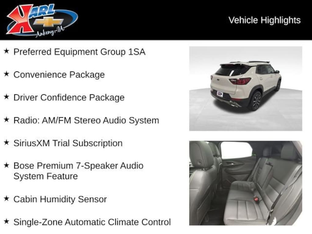 Factory MSRP: $35,470 $2,091 off MSRP! 26/29 City/Highway MPG 120-Volt Power Outlet, 2-Way Power Driver Lumbar Seat Adjuster, 4-Way Manual Front Passenger Seat Adjuster, Adaptive Cruise Control, Bose Premium 7-Speaker Audio System Feature, Cabin Humidity Sensor, Convenience Package, Driver Confidence Package, Dual-Pane Panoramic Power Sunroof, Evotex Seat Trim, Flat-Folding Front Passenger Seatback, Front Bucket Seats, Front Center Armrest, Hands Free Power Programmable Liftgate, Inside Rear-View Auto-Dimming Mirror, Preferred Equipment Group 1SA, Radio: AM/FM Stereo Audio System, Rear Cross Traffic Alert, Rear Park Assist, Single-Zone Automatic Climate Control, SiriusXM Trial Subscription, Split folding rear seat, Wheels: 17 High Gloss Black Machined Aluminum, Wireless Apple CarPlay/Android Auto, Wireless Charging.