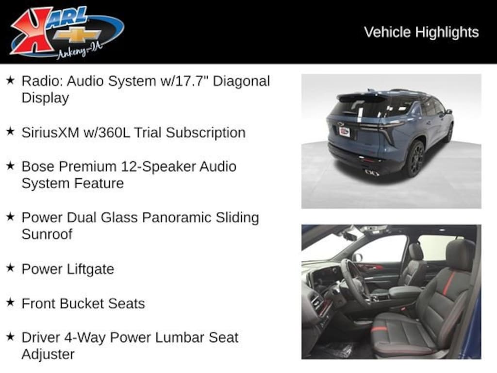 Factory MSRP: $61,094 AWD, 3rd row seats: split-bench, Bose Premium 12-Speaker Audio System Feature, Driver 4-Way Power Lumbar Seat Adjuster, Front Bucket Seats, Front Center Armrest, Front Passenger 4-Way Power Lumbar Seat Adjuster, Heated Driver & Front Passenger Seats, Heated rear seats, Perforated Leather-Appointed Seat Trim, Power Dual Glass Panoramic Sliding Sunroof, Power Liftgate, Power passenger seat, Radio: Audio System w/17.7 Diagonal Display, SiriusXM w/360L Trial Subscription, Ventilated Driver & Front Passenger Seats, Wheels: 22 High Gloss Black Painted Aluminum.