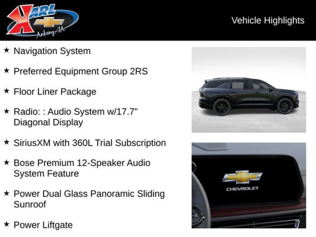 The 2026 Chevrolet Traverse RS In-Transit is a remarkable SUV that combines style, performance, and cutting-edge technology. This stunning black beauty boasts a powerful 2.5L DOHC engine paired with an 8-speed automatic transmission and all-wheel drive, delivering an exceptional driving experience.