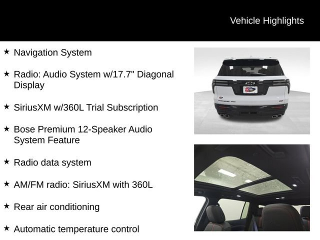 Factory MSRP: $61,790 3rd row seats: split-bench, 8-Way Power Driver Seat Adjuster, Air Conditioning, AM/FM radio: SiriusXM with 360L, Automatic temperature control, Bose Premium 12-Speaker Audio System Feature, Brake assist, Child-Seat-Sensing Airbag, Driver vanity mirror, Dual front side impact airbags, Electronic Stability Control, Emergency communication system: OnStar, Exterior Parking Camera Rear, Four wheel independent suspension, Front anti-roll bar, Front Bucket Seats, Front Center Armrest, Front dual zone A/C, Front Passenger 4-Way Power Lumbar Seat Adjuster, Front reading lights, Garage door transmitter, Heated door mirrors, Heated Driver & Front Passenger Seats, Heated front seats, Heated rear seats, Heated steering wheel, Memory seat, Navigation System, Occupant sensing airbag, Overhead airbag, Overhead console, Passenger vanity mirror, Perforated Leather-Appointed Seat Trim, Power driver seat, Power Liftgate, Power passenger seat, Power steering, Radio data system, Radio: Audio System w/17.7 Diagonal Display, Rain sensing wipers, Rear air conditioning, Rear reading lights, Rear window defroster, Rear window wiper, Remote keyless entry, SiriusXM w/360L Trial Subscription, Speed-sensing steering, Sport steering wheel, Steering wheel memory, Trip computer, Ventilated Driver & Front Passenger Seats, Ventilated front seats, Wheels: 22 High Gloss Black Painted Aluminum.Recent Arrival!White 2026 Chevrolet Traverse 4D Sport Utility RS 2.5L DOHC 20/24 City/Highway MPG 8-Speed Automatic AWDHere at Karl Chevrolet of Stuart we want to help you find the best vehicle to suit your needs. With our huge selection of new and pre-owned vehicles, we're sure to have the right car for you! We pride ourselves on creating a friendly buying experience and earning the title of Your Dealer for Life. Give us a call at 515.523.1201 and speak to our experts to find out just how easy it is to get the vehicle of your dreams!