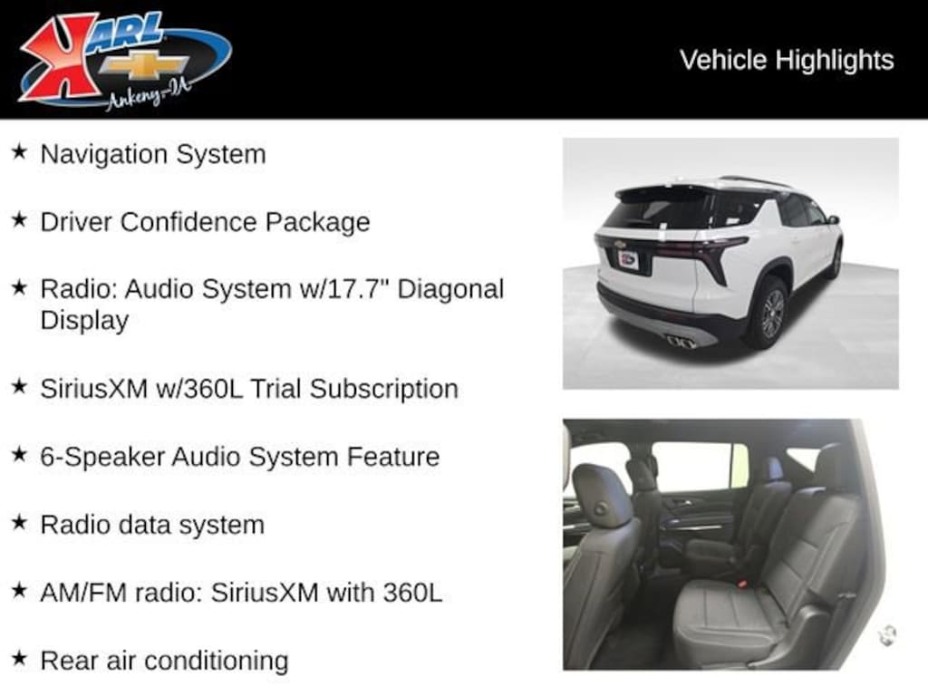 Factory MSRP: $45,920 AWD, 3rd row seats: split-bench, 4-Way Manual Front Passenger Seat Adjuster, 6-Speaker Audio System Feature, 8-Way Power Driver Seat Adjuster, Air Conditioning, AM/FM radio: SiriusXM with 360L, Automatic temperature control, Brake assist, Bumpers: body-color, Child-Seat-Sensing Airbag, Compass, Driver Confidence Package, Driver door bin, Dual front impact airbags, Electronic Stability Control, Emergency communication system: OnStar, Front Bucket Seats, Front Center Armrest, HD Surround Vision, Heated front seats, Heated steering wheel, Key Card, Navigation System, Outside temperature display, Overhead airbag, Overhead console, Passenger vanity mirror, Power driver seat, Power Liftgate, Power Outlet, Power steering, Radio data system, Radio: Audio System w/17.7 Diagonal Display, Rear air conditioning, Rear Camera Mirror, Rear Pedestrian Alert, Rear reading lights, Rear window wiper, Remote keyless entry, SiriusXM w/360L Trial Subscription, Telescoping steering wheel, Traffic Sign Recognition, Wheels: 18 Grazen Metallic Machined-Face Aluminum.