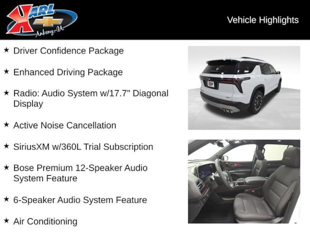 Factory MSRP: $58,450 AWD, 3 Years OnStar One (R9M), 3rd row seats: split-bench, 4-Way Manual Front Passenger Seat Adjuster, 6-Speaker Audio System Feature, 8-Way Power Driver Seat Adjuster, Active Noise Cancellation, Air Conditioning, Bose Premium 12-Speaker Audio System Feature, Brake assist, Driver Attention Assist, Driver Confidence Package, Driver vanity mirror, Dual front impact airbags, Dual front side impact airbags, Enhanced Automatic Parking Assist, Enhanced Driving Package, Evotex Seat Trim, Front Bucket Seats, Front Center Armrest, Front dual zone A/C, HD Surround Vision, Heated Driver & Front Passenger Seats, Heated front seats, Heated steering wheel, Key Card, Occupant sensing airbag, Outside temperature display, Overhead console, Power driver seat, Power Dual Glass Panoramic Sliding Sunroof, Power Liftgate, Power Outlet, Power windows, Radio: Audio System w/17.7 Diagonal Display, Rear air conditioning, Rear Camera Mirror, Rear Pedestrian Alert, Rear window defroster, Rear window wiper, Remote keyless entry, SiriusXM w/360L Trial Subscription, Super Cruise, Tachometer, Traffic Sign Recognition, Turn signal indicator mirrors, Wheels: 18 High Gloss Black Painted Aluminum.