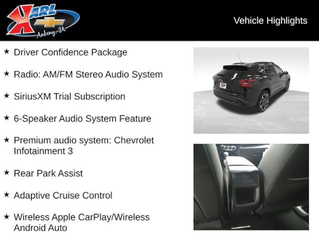 Factory MSRP: $27,789 28/32 City/Highway MPG 2-Way Adjustable Front Head Restraints, 2-Way Power Driver Lumbar Seat Adjuster, 4-Way Manual Front Passenger Seat Adjuster, 6-Speaker Audio System Feature, Adaptive Cruise Control, Driver Confidence Package, Evotex Seat Trim, Front Bucket Seats, Front Center Armrest, Premium audio system: Chevrolet Infotainment 3, Radio: AM/FM Stereo Audio System, Rear Cross Traffic Alert, Rear Park Assist, SiriusXM Trial Subscription, Split folding rear seat, Wheels: 19 Black-Painted Machined Aluminum, Wireless Apple CarPlay/Wireless Android Auto.
