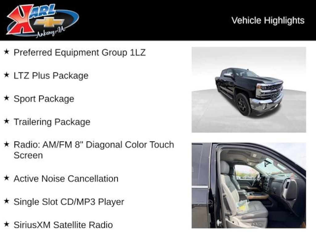 Recent Arrival! Certified. Local Trade! Equipped With Mud Flaps, Running Boards, Bed Liner, Tonneau Cover & 20 Inch Fuel Wheels! Black 2018 Chevrolet Silverado 1500 LTZ 4WD CREW CAB 143.5 LTZ W/1LZ EcoTec3 6.2L V8 8-Speed Automatic with Overdrive, 4WD, Dark Ash With Jet Black Interior Accents Leather, 110-Volt AC Power Outlet, 150 Amp Alternator, 4.2 Diagonal Color Display Driver Info Center, 6 Speaker Audio System, Active Noise Cancellation, Auto-Dimming Inside Rear-View Mirror, Auxiliary External Transmission Oil Cooler, Bluetooth® For Phone, Bose Speaker System, Chevrolet Connected Access, Chevrolet w/4G LTE, Chrome Bodyside Moldings, Chrome Cap Power-Adjustable Heated Outside Mirrors, Chrome Door Handles, Chrome Grille Surround, Chrome Mirror Caps, Color-Keyed Carpeting w/Rubberized Vinyl Floor Mats, Deep-Tinted Glass, Driver & Front Passenger Illuminated Vanity Mirrors, Dual-Zone Automatic Climate Control, Electric Rear-Window Defogger, EZ Lift & Lower Tailgate, Front Chrome Bumper, Front Frame-Mounted Black Recovery Hooks, HD Radio, Heated & Vented Front Seating, Heavy-Duty Rear Locking Differential, Integrated Trailer Brake Controller, Leather Wrapped Heated Steering Wheel w/Cruise Controls, LED Taillamps w/Signature, LTZ Plus Package, Manual Tilt/Telescoping Steering Column, Memory seat, OnStar & Chevrolet Connected Services Capable, Power Adjustable Pedals, Power driver seat, Power Sliding Rear Window, Power Windows w/Driver Express Up, Preferred Equipment Group 1LZ, Radio: AM/FM 8 Diagonal Color Touch Screen, Rear 60/40 Folding Bench Seat (Folds Up), Rear Chrome Bumper, Rear Wheelhouse Liners, Remote Keyless Entry, Remote Locking Tailgate, Remote Vehicle Starter System, Single Slot CD/MP3 Player, SiriusXM Satellite Radio, Sport Package, Steering Wheel Audio Controls, Theft Deterrent System (Unauthorized Entry), Thin Profile LED Fog Lamps, Trailering Package, Ultrasonic Front & Rear Park Assist, Universal Home Remote, Wheels: 20 x 9 Chrome, Wireless Charging. 15/20 City/Highway MPG 8-Speed Automatic with Overdrive 4WDAt Karl Chevrolet we want to help you find the best new or used car in Ankeny that suits your needs. Check out the 2018 Chevrolet Silverado 1500 For Sale in Ankeny, IA. When you buy a new car at Karl Chevrolet you know you're finding a vehicle you can rely on. We have a great selection of Platinum Quality Pre-Owned Vehicles. We also pride ourselves in creating a friendly atmosphere and reliable new car dealership that you can trust. Call us with any questions about our 2018 Chevrolet Silverado 1500 and our experts will be glad to help you! (515) 299-4300. *Equipment and options are generated by a 3rd party vendor, exact vehicle options may vary. Please see a salesperson for complete details and vehicle information.Certification Program Details: Karl Chevrolet of Ankeny, your newest CarBravo dealer, where platinum quality vehicles and unmatched benefits come together! -Comprehensive Limited Bumper to Bumper Warranty. -24/7 Roadside Assistance: -Multi-Point Vehicle Inspection: Every vehicle undergoes a Platinum Quality Certified Inspection known throughout the industry to ensure top quality. -Vehicle Exchange Program. Within 10-Days and 500 miles -Complimentary Vehicle History Report -Nationwide Dealer Network Support: Enjoy the backing of the extensive CarBravo and GM dealership network. -OnStar and SiriusXM Trials: Enjoy connected services and entertainment with included trial subscriptions. -Terms and conditions may apply. With every vehicle purchased, you'll enjoy the peace of mind that comes with a limited warranty, 24/7 roadside assistance, and a comprehensive vehicle inspection.