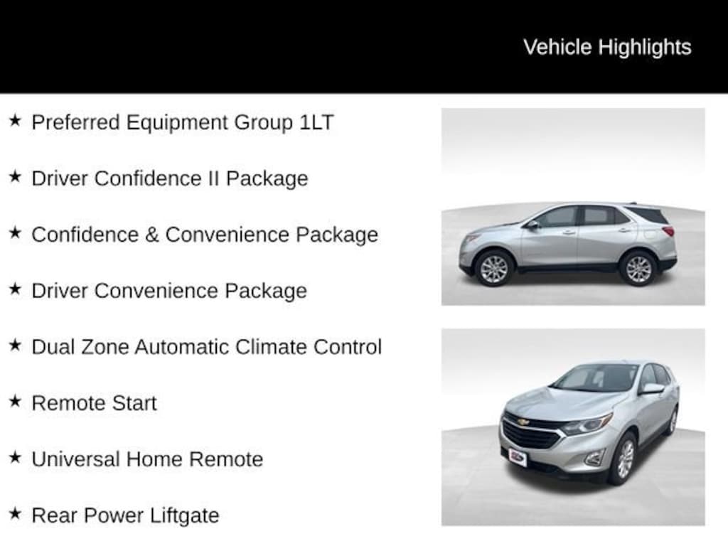 The Equinox LT is packed with a wealth of advanced features that will enhance your driving experience. Enjoy the convenience of remote start, a power liftgate, and universal home remote, as well as the comfort of dual-zone automatic climate control and heated front seats. Stay connected with the Chevrolet Infotainment 3 system, featuring Apple CarPlay and Android Auto compatibility.