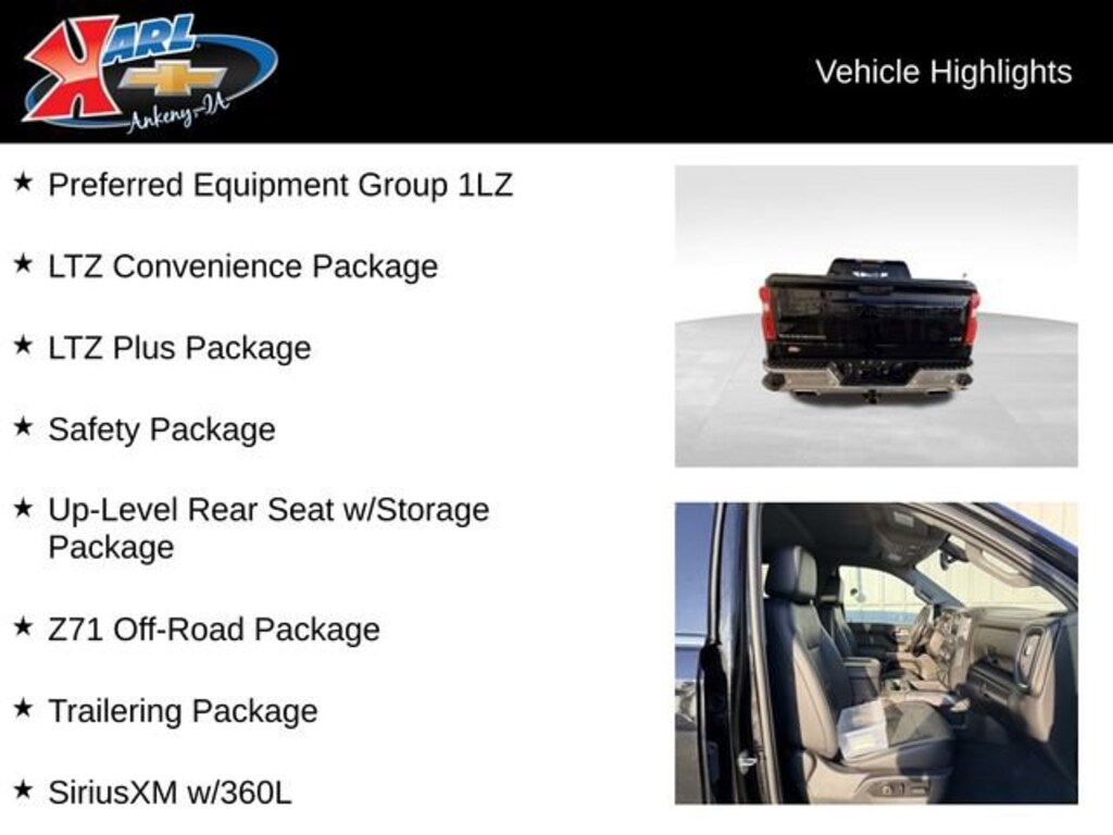 Recent Arrival! CARFAX One-Owner, Local Trade & Sold New at Karls! Equipped With Running Boards, Bed Liner & Tonneau Cover! Clean CARFAX. Certified. Black 2020 Chevrolet Silverado 1500 LTZ 4WD CREW CAB 147 LTZ EcoTec3 5.3L V8 8-Speed Automatic, 4WD, Jet Black Leather, 2 USB Ports (First Row), 2nd Row Heated Outboard Seats, 4.2 Diagonal Color Display Driver Info Center, 4G LTE Wi-Fi Hot Spot Capable, 6-Speaker Audio System, Advanced Trailering System, Apple CarPlay/Android Auto, Auto-Dimming Inside Rear-View Mirror, Auxiliary External Transmission Oil Cooler, Bluetooth® For Phone, Chevrolet Connected Access Capable, Chrome Grille, Chrome Mirror Caps, Color-Keyed Carpeting Floor Covering, Compass, Deep-Tinted Glass, Driver Memory, Electric Rear-Window Defogger, Electrical Lock Control Steering Column, EZ Lift Power Lock & Release Tailgate, Floor Mounted Center Console, Front Bucket Seats, Front dual zone A/C, Front Frame-Mounted Black Recovery Hooks, Front LED Fog Lamps, Front Rubberized Vinyl Floor Mats, HD Radio, HD Rear Vision Camera, Heated Driver & Front Outboard Passenger Seats, Heated Steering Wheel, Heavy-Duty Rear Locking Differential, Hill Descent Control, Hitch Guidance w/Hitch View, Integrated Trailer Brake Controller, Keyless Open & Start, Lane Change Alert w/Side Blind Zone Alert, Leather Wrapped Steering Wheel, LED Cargo Area Lighting, LTZ Convenience Package, LTZ Plus Package, Manual Tilt/Telescoping Steering Column, Off-Road Suspension, OnStar & Chevrolet Connected Services Capable, Outside Heated Power-Adjustable Mirrors, Perimeter Lighting, Power Door Locks, Power driver seat, Power Sliding Rear Window w/Rear Defogger, Power Tailgate, Power windows, Preferred Equipment Group 1LZ, Rear Cross Traffic Alert, Rear Dual USB Charging-Only Ports, Rear Rubberized-Vinyl Floor Mats, Rear Wheelhouse Liners, Remote Vehicle Starter System, Safety Package, SiriusXM w/360L, Steering Wheel Audio Controls, Steering Wheel Mounted Electronic Cruise Control, Theft Deterrent System (Unauthorized Entry), Trailering Package, Ultrasonic Front & Rear Park Assist, Universal Home Remote, Up-Level Rear Seat w/Storage Package, Ventilated Driver & Front Passenger Seats, Wheels: 20 x 9 Polished Finish, Z71 Off-Road Package. 16/22 City/Highway MPG 8-Speed Automatic 4WDCertification Program Details: Karl Chevrolet of Ankeny, your newest CarBravo dealer, where platinum quality vehicles and unmatched benefits come together! -Comprehensive Limited Bumper to Bumper Warranty. -24/7 Roadside Assistance: -Multi-Point Vehicle Inspection: Every vehicle undergoes a Platinum Quality Certified Inspection known throughout the industry to ensure top quality. -Vehicle Exchange Program. Within 10-Days and 500 miles -Complimentary Vehicle History Report -Nationwide Dealer Network Support: Enjoy the backing of the extensive CarBravo and GM dealership network. -OnStar and SiriusXM Trials: Enjoy connected services and entertainment with included trial subscriptions. -Terms and conditions may apply. With every vehicle purchased, you'll enjoy the peace of mind that comes with a limited warranty, 24/7 roadside assistance, and a comprehensive vehicle inspection.