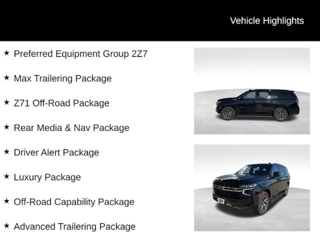 1st & 2nd Row Color-Keyed Carpeted Floor Mats, 2 USB Data Ports, 2-Speed Active Electronic AutoTrac Transfer Case, 2nd Row Pwr Release 60/40 Split-Folding Bench Seat, 3rd Row 60/40 Power-Folding Split-Bench Seat, Advanced Trailering Package, Advanced Trailering System, Air Ride Adaptive Suspension, Auto-Dimming Inside Rear-View Mirror, Automatic Heated Steering Wheel, Black Tubular Assist Steps, Bright Front & Rear Door Sill Plates, Color-Keyed Carpeting Floor Covering, Driver & Front Outboard Passenger Airbags, Driver Alert Package, Enhanced Driver Information Center, Extra Capacity Cooling System, Floor Console w/Storage Area, Front & Rear Park Assist, Front High-Approach Angle Fascia, Hands-Free Rear Power Programmable Liftgate, HD Radio, HD Surround Vision, Heated 2nd Row Outboard Seats, Hill Descent Control, Hitch Guidance w/Hitch View, Infotainment Display, Integrated Trailer Brake Controller, Lane Change Alert w/Side Blind Zone Alert, Lane Keep Assist w/Lane Departure Warning, Leather-Wrapped Steering Wheel, LED Daytime Running Lamps, Luxury Package, Magnetic Ride Control Suspension, Max Trailering Package, Memory Settings, Memory Settings for Driver, Off-Road Capability Package, Outside Heated Power-Adjustable Mirrors, Power Tilt & Telescopic Steering Column, Preferred Equipment Group 2Z7, Radio: Chevrolet Infotainment 3 Premium System, Rear Cross Traffic Alert, Rear Media & Nav Package, Rear Pedestrian Alert, Rear Seat Media System, Red Horizontal-Mounted Recovery Hooks, Remote Start, SiriusXM NavTraffic, SiriusXM Radio w/360L, Universal Home Remote, Z71 Off-Road Package.