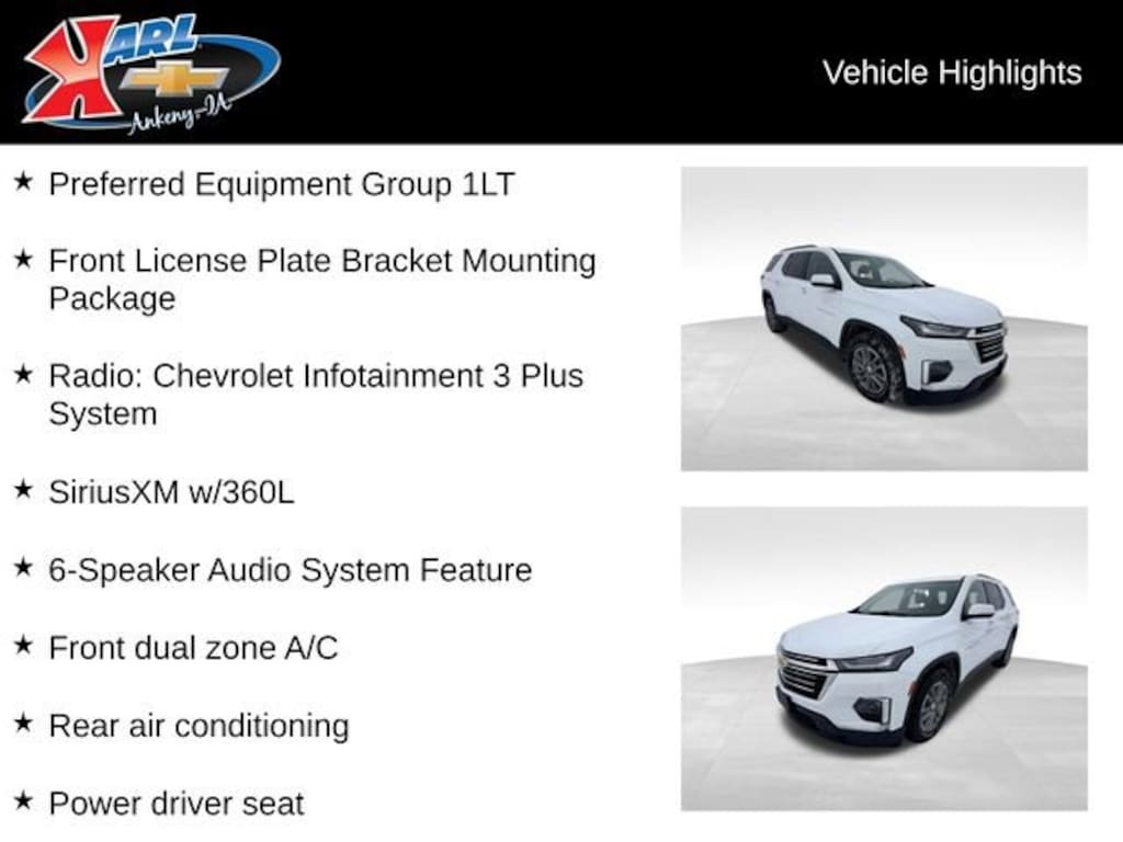 At Karl Chevrolet we want to help you find the best new or used car in Ankeny that suits your needs. Check out the 2022 Chevrolet Traverse For Sale in Ankeny, IA. When you buy a new car at Karl Chevrolet you know you're finding a vehicle you can rely on. We have a great selection of Platinum Quality Pre-Owned Vehicles. We also pride ourselves in creating a friendly atmosphere and reliable new car dealership that you can trust. Call us with any questions about our 2022 Chevrolet Traverse and our experts will be glad to help you! (515) 299-4300. *Equipment and options are generated by a 3rd party vendor, exact vehicle options may vary. Please see a salesperson for complete details and vehicle information.