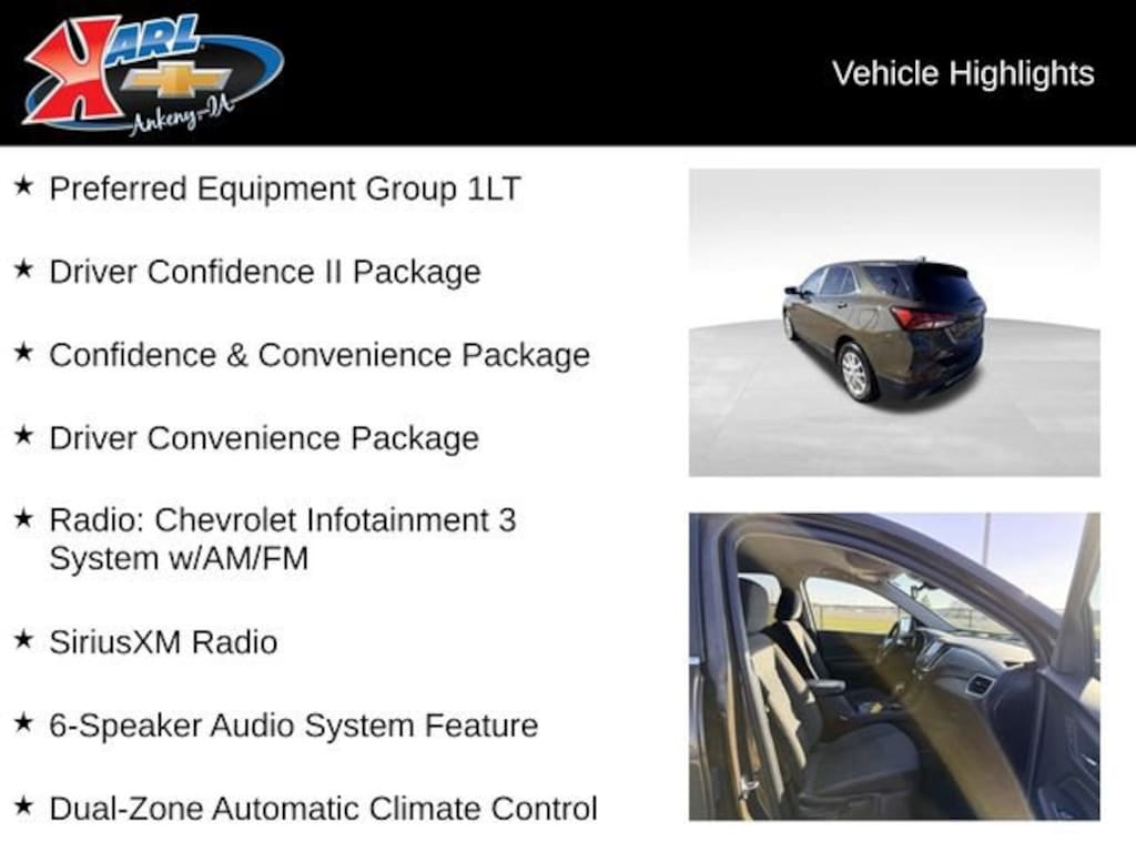 Certification Program Details: Karl Chevrolet of Ankeny, The Nation's #1 CarBravo Certified Dealer! Every CarBravo Certified vehicle includes: Comprehensive 126-Point Inspection Professionally inspected by factory-trained technicians to meet strict mechanical, safety, and cosmetic standards. 12-Month / 12,000-Mile Bumper-to-Bumper Limited Warranty Enjoy added peace of mind with extensive coverage from the day you drive off the lot. 24/7 Roadside Assistance & Courtesy Transportation Flat tire? Dead battery? Need a tow? You're covered anywhere, anytime throughout the warranty period. Vehicle History & Title Guarantee Clean title, completed safety recalls, and a full CARFAX® or AutoCheck® report provided for complete transparency. 10-Day / 500-Mile Exchange Promise If you don't absolutely love it, bring it back and exchange it no hassle, no stress. Experience peace of mind and premium protection exclusively from Karl Chevrolet of Ankeny, the Nation's #1 CarBravo Dealer!- CONFIDENCE & CONVENIENCE PACKAGE- Driver Confidence II Package- Driver Convenience Package- Preferred Equipment Group 1LT- 6-Speaker Audio System Feature- Radio: Chevrolet Infotainment 3 System w/AM/FM- SiriusXM Radio- Dual-Zone Automatic Climate Control- Bluetooth® For Phone- Power driver seat- Remote Start- Rear Power Liftgate- Auto High-beam Headlights- 2 Rear USB Charging-Only Ports- 2 USB Ports & Auxiliary Input Jack- Wireless Apple CarPlay/Wireless Android Auto- Front & Rear Park Assist- Heated Driver & Front Passenger SeatsThis 2023 Chevrolet Equinox LT FWD 4DR LT W/1LT is a well-equipped and versatile SUV that offers a compelling blend of style, comfort, and advanced technology. With its sleek exterior design, spacious interior, and impressive fuel efficiency, this Equinox is the perfect companion for your daily commute or weekend adventures.Powered by a 1.5L DOHC engine and a 6-speed automatic transmission, this Equinox delivers a smooth and responsive driving experience, with an EPA-estimated 26 city/31 highway MPG to help you save on fuel costs. The Confidence & Convenience Package further enhances the driving experience with features like Front and Rear Park Assist, Auto High-beam Headlights, and Heated Front Seats, ensuring your comfort and confidence on the road.Inside, the Equinox LT W/1LT offers a wealth of premium amenities, including Dual-Zone Automatic Climate Control, Wireless Apple CarPlay and Android Auto, and a 6-speaker audio system with SiriusXM Radio. The Preferred Equipment Group 1LT also adds conveniences like a Power Driver's Seat, Remote Start, and a Rear Power Liftgate, making your daily routine more effortless.As a CarBravo Certified vehicle, this Equinox has undergone a rigorous 126-point inspection by our factory-trained technicians, ensuring it meets the highest standards of quality and safety. With the added benefits of a 12-month/12,000-mile Bumper-to-Bumper Limited Warranty, 24/7 Roadside Assistance, and a 10-Day/500-Mile Exchange Promise, you can drive with confidence knowing that your investment is protected.At Karl Chevrolet, we want to help you find the best new or used car in Ankeny that suits your needs. When you buy a new car at Karl Chevrolet you know you're finding a vehicle you can rely on. We have a great selection of Platinum Quality Pre-Owned Vehicles. We also pride ourselves in creating a friendly atmosphere and a reliable Dealership that you can trust. Call us and our experts will be glad to help you! (515) 299-4300. *Equipment and options are generated by a 3rd party vendor, exact vehicle options may vary. Please see a salesperson for complete details and vehicle information.