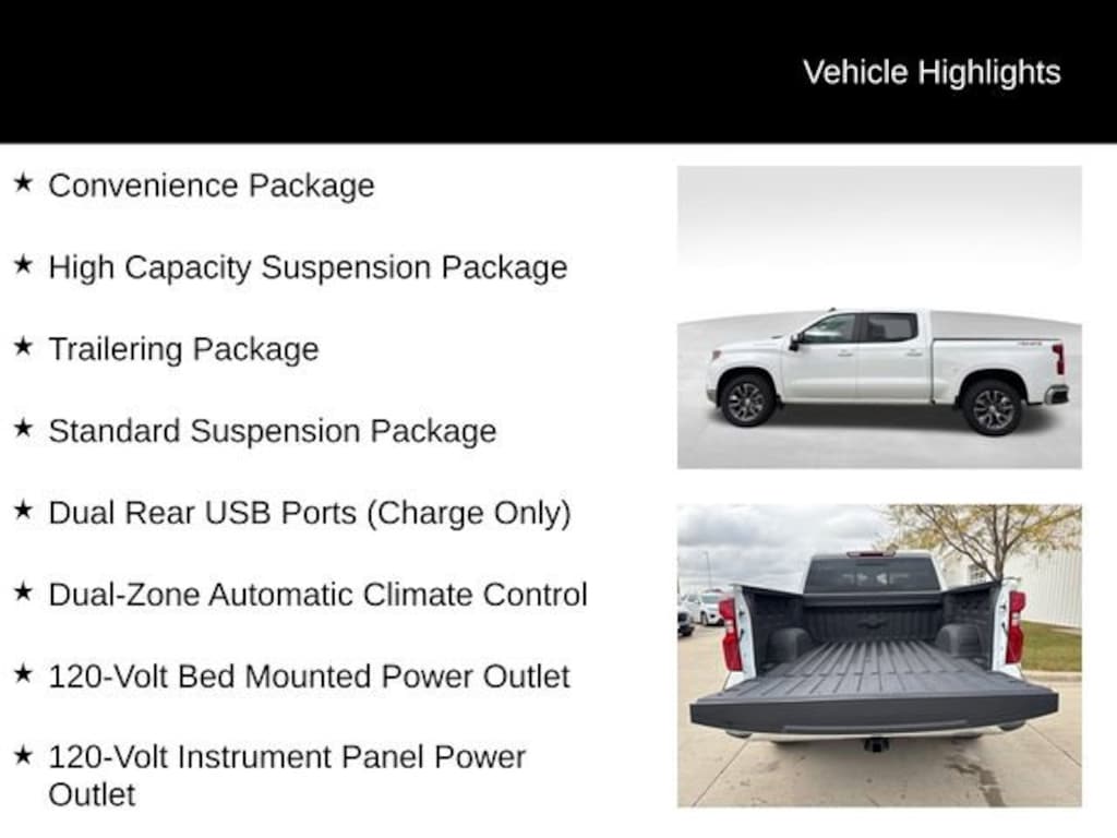 10-Way Power Driver Seat w/Lumbar, 120-Volt Bed Mounted Power Outlet, 120-Volt Instrument Panel Power Outlet, Convenience Package, Dual Rear USB Ports (Charge Only), Dual-Zone Automatic Climate Control, Heated Driver & Front Outboard Passenger Seats, Heated Steering Wheel, High Capacity Suspension Package, Hitch Guidance, Keyless Open & Start, Standard Suspension Package, Trailering Package, Wrapped Steering Wheel.