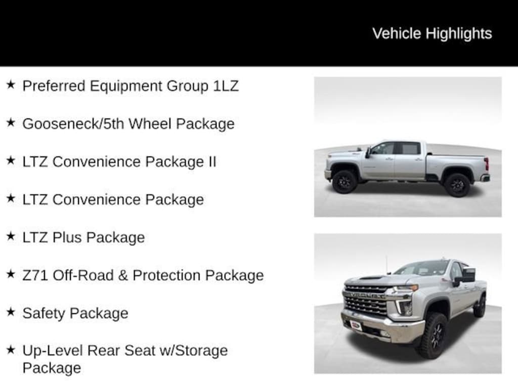 Certified.Silver Ice Metallic LTZ 4WD Duramax 6.6L V8 Turbodiesel12-Volt Rear Auxiliary Power Outlet, 120-Volt Bed Mounted Power Outlet, 120-Volt Instrument Panel Power Outlet, 170 Amp Alternator, 1st & 2nd Row All-Weather Floor Liners (LPO) (AAK), 2 USB Ports (1st Row), 2 USB Ports & 1 SD Card Reader, 2-Speed Active Electronic AutoTrac Transfer Case, 4.2 Diagonal Color Display Driver Info Center, Advanced Trailering System, Auto-Dimming Inside Rear-View Mirror, Bed View Camera w/2 Trailer Camera Provisions, Black Chevytec Spray-On Bedliner, Bluetooth® For Phone, BOSE Premium 7-Speaker Sound System, Chevrolet Connected Access Capable, Chrome Front Grille, Chrome Mirror Caps, Color-Keyed Carpeting Floor Covering, Compass, Deep-Tinted Glass, Dual Charge-Only USB Ports (2nd Row), Electric Rear-Window Defogger, Electrical Lock Control Steering Column, Electronic Cruise Control w/Set & Resume Speed, EZ Lift Power Lock & Release Tailgate, Floor-Mounted Center Console, Front Bucket Seats, Front LED Fog Lamps, Front Rubberized Vinyl Floor Mats, Gooseneck/5th Wheel Package, Gooseneck/5th Wheel Prep Package, HD Rear Vision Camera, HD Surround Vision w/2 Trailer View Camera Provisions, Heated & Auto-Dim Pwr Vertical Trailering Mirrors, Heated 2nd Row Outboard Seats, Heated Steering Wheel, Hill Descent Control, Hitch Guidance w/Hitch View, Integrated Trailer Brake Controller, Keyless Open & Start, Lane Change Alert w/Side Blind Zone Alert, LED Cargo Area Lighting, LTZ Convenience Package, LTZ Convenience Package II, LTZ Plus Package, Manual Tilt & Telescoping Steering Column, Off-Road Suspension, OnStar & Chevrolet Connected Services Capable, Power Door Locks, Power Front Windows w/Driver Express Up/Down, Power Front Windows w/Passenger Express Up/Down, Power Rear Windows w/Express Down, Power Sliding Rear Window w/Defogger, Preferred Equipment Group 1LZ, Radio: Chevrolet Infotainment 3 Premium System, Rear Cross Traffic Alert, Rear Rubberized Vinyl Floor Mats, Rear Wheelhouse Liners, Remote Vehicle Starter System, Safety Package, SiriusXM w/360L, Standard Tailgate, Steering Wheel Audio Controls, Ultrasonic Front & Rear Park Assist, Unauthorized Entry Theft-Deterrent System, Universal Home Remote, Up-Level Rear Seat w/Storage Package, Ventilated Driver & Front Passenger Seats, Wheels: 20 6-Spoke Polished Aluminum, Wi-Fi Hotspot Capable, Wireless Charging, Wireless Phone Projection, Wrapped Steering Wheel, Z71 Off-Road & Protection Package, Z71 Off-Road Package.Here at Karl Chevrolet of Stuart we want to help you find the best vehicle to suit your needs. With our huge selection of new and pre-owned vehicles, we're sure to have the right car for you! We pride ourselves on creating a friendly buying experience and earning the title of Your Dealer for Life. Give us a call at 515.523.1201 and speak to our experts to find out just how easy it is to get the vehicle of your dreams!*Equipment and options are generated by a 3rd party vendor, exact vehicle options may vary. Please see a salesperson for complete details and vehicle information.Clean CARFAX. CARFAX One-Owner.Certification Program Details: Karl Chevrolet of Stuart, your newest CarBravo dealer, where platinum quality vehicles and unmatched benefits come together! -Comprehensive Limited Bumper to Bumper Warranty. -24/7 Roadside Assistance: -Multi-Point Vehicle Inspection: Every vehicle undergoes a Platinum Quality Certified Inspection known throughout the industry to ensure top quality. -Vehicle Exchange Program. Within 10-Days and 500 miles -Complimentary Vehicle History Report -Nationwide Dealer Network Support: Enjoy the backing of the extensive CarBravo and GM dealership network. -OnStar and SiriusXM Trials: Enjoy connected services and entertainment with included trial subscriptions. -Terms and conditions may apply. With every vehicle purchased, you'll enjoy the peace of mind that comes with a limited warranty, 24/7 roadside assistance, and a com
