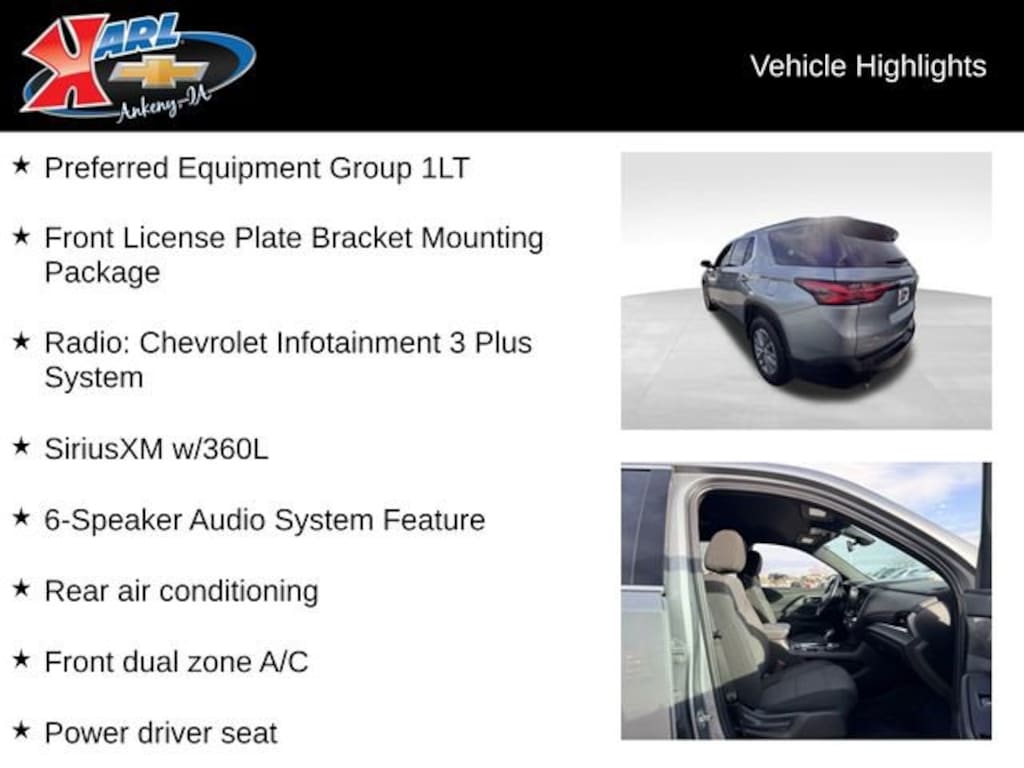 At Karl Chevrolet we want to help you find the best new or used car in Ankeny that suits your needs. Check out the 2023 Chevrolet Traverse For Sale in Ankeny, IA. When you buy a new car at Karl Chevrolet you know you're finding a vehicle you can rely on. We have a great selection of Platinum Quality Pre-Owned Vehicles. We also pride ourselves in creating a friendly atmosphere and reliable new car dealership that you can trust. Call us with any questions about our 2023 Chevrolet Traverse and our experts will be glad to help you! (515) 299-4300. *Equipment and options are generated by a 3rd party vendor, exact vehicle options may vary. Please see a salesperson for complete details and vehicle information.