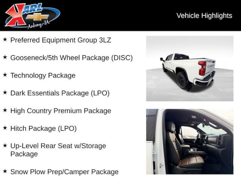 Recent Arrival! CARFAX One-Owner & Local Trade! Equipped With Mud Flaps. Bed Liner, Tonneau Cover, Power Running Boards & Bug Shield! Clean CARFAX. Certified. Summit White 2024 Chevrolet Silverado 2500HD High Country 4WD CREW CAB 159 HIGH COUNTRY Duramax 6.6L V8 Turbodiesel 10-Speed Automatic, 4WD, Jet Black/Umber Leather, 10-Way Power Driver Seat Adjuster w/Lumbar, 10-Way Power Passenger Seat Adjuster w/Lumbar, 15 Diagonal Multicolor Head-Up Display, 170 Amp Alternator, 220 Amp Alternator, 6 Rectangular Chromed Tubular Assist Steps, Adaptive Cruise Control, Apple CarPlay/Android Auto, Auto High-beam Headlights, Auto-Dimming Inside Rear-View Mirror, Bed View Camera w/2 Trailer Camera Provisions, Black Molded Splash Guards (LPO), Black Name Plates (LPO), Black Tailgate Lettering (LPO), Bluetooth® For Phone, BOSE Premium 7-Speaker Sound System, Chevrolet Connected Access Capable, Chrome Door Handles, Chrome Mirror Caps, Color-Keyed Carpeting Floor Covering, Compass, Dark Essentials Package (LPO), Deep-Tinted Glass, Electric Rear-Window Defogger, Electronic Cruise Control w/Set & Resume Speed, Front Black Bowtie Emblem (LPO), Front Carpeted Floor Mats, Front Chrome Recovery Hooks, Front dual zone A/C, Front LED Fog Lamps, Front Rain-Sensing Wipers, Gooseneck/5th Wheel Package (DISC), Gooseneck/5th Wheel Prep Package, Heated 2nd Row Outboard Seats, Heated Driver & Front Outboard Passenger Seating, Heated Steering Wheel, High Country Premium Package, Hill Descent Control, Hitch Guidance w/Hitch View, Hitch Package (LPO), In-Vehicle Trailering App System, Keyless Open & Start, LED Cargo Area Lighting, Manual Tilt & Telescoping Steering Column, Memory seat, Off-Road Suspension, OnStar & Chevrolet Connected Services Capable, Polished Exhaust Tip, Power Door Locks, Power Front Windows w/Driver Express Up/Down, Power Front Windows w/Passenger Express Up/Down, Power Rear Windows w/Express Down, Power Sliding Rear Window w/Defogger, Power Sunroof, Preferred Equipment Group 3LZ, Push Button Start, Pwr Up/Down Tailgate Function w/Pwr Lock & Release, Rear Camera Mirror, Rear Carpeted Floor Mats, Rear Cross Traffic Alert, Rear Wheelhouse Liners, Remote Vehicle Starter System, SiriusXM w/360L, Snow Plow Prep/Camper Package, Standard Tailgate, Steering Wheel Audio Controls, Suspension Package, Technology Package, Trailer Camera Provisions, Ultrasonic Front & Rear Park Assist, Unauthorized Entry Theft-Deterrent System, Universal Home Remote, Up-Level Rear Seat w/Storage Package, Ventilated Driver & Front Passenger Seats, Wheels: 20 8-Spoke Polished, Wi-Fi Hotspot Capable, Wireless Charging, Wireless Phone Projection, Wrapped Steering Wheel, Z71 Off-Road Package. 10-Speed Automatic 4WDCertification Program Details: Karl Chevrolet of Ankeny, your newest CarBravo dealer, where platinum quality vehicles and unmatched benefits come together! -Comprehensive Limited Bumper to Bumper Warranty. -24/7 Roadside Assistance: -Multi-Point Vehicle Inspection: Every vehicle undergoes a Platinum Quality Certified Inspection known throughout the industry to ensure top quality. -Vehicle Exchange Program. Within 10-Days and 500 miles -Complimentary Vehicle History Report -Nationwide Dealer Network Support: Enjoy the backing of the extensive CarBravo and GM dealership network. -OnStar and SiriusXM Trials: Enjoy connected services and entertainment with included trial subscriptions. -Terms and conditions may apply. With every vehicle purchased, you'll enjoy the peace of mind that comes with a limited warranty, 24/7 roadside assistance, and a comprehensive vehicle inspection.