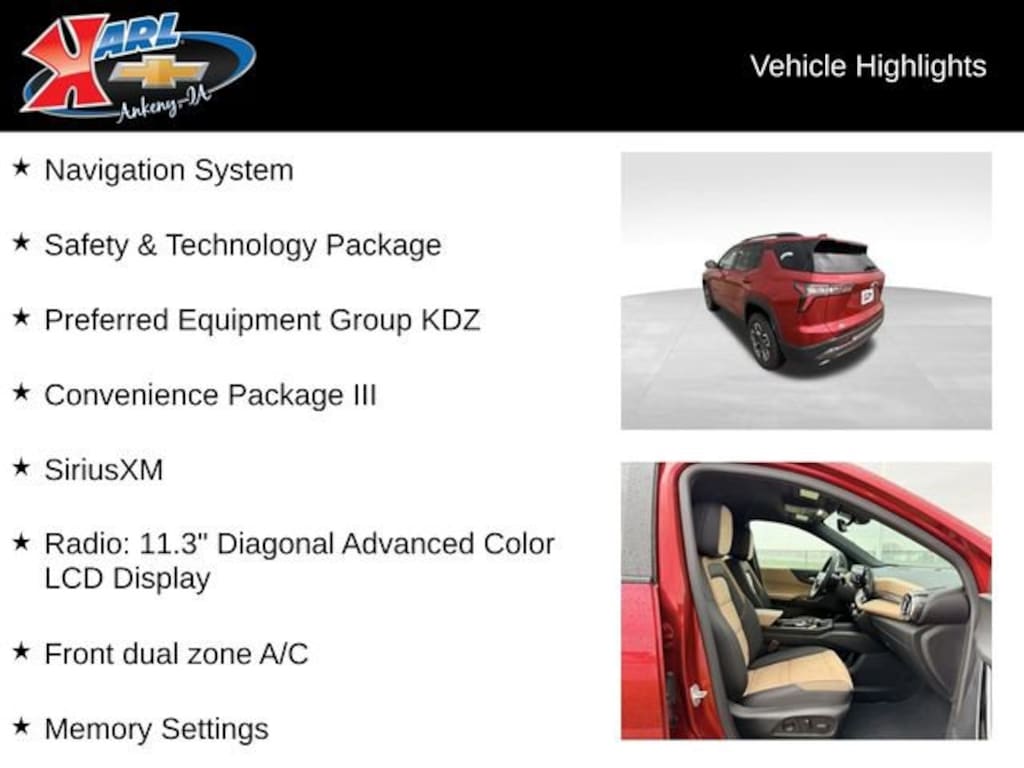 At Karl Chevrolet we want to help you find the best new or used car in Ankeny that suits your needs. When you buy a new car at Karl Chevrolet you know you're finding a vehicle you can rely on. We have a great selection of Platinum Quality Pre-Owned Vehicles. We also pride ourselves in creating a friendly atmosphere and a reliable Dealership that you can trust. Call us and our experts will be glad to help you! (515) 299-4300. *Equipment and options are generated by a 3rd party vendor, exact vehicle options may vary. Please see a salesperson for complete details and vehicle information.